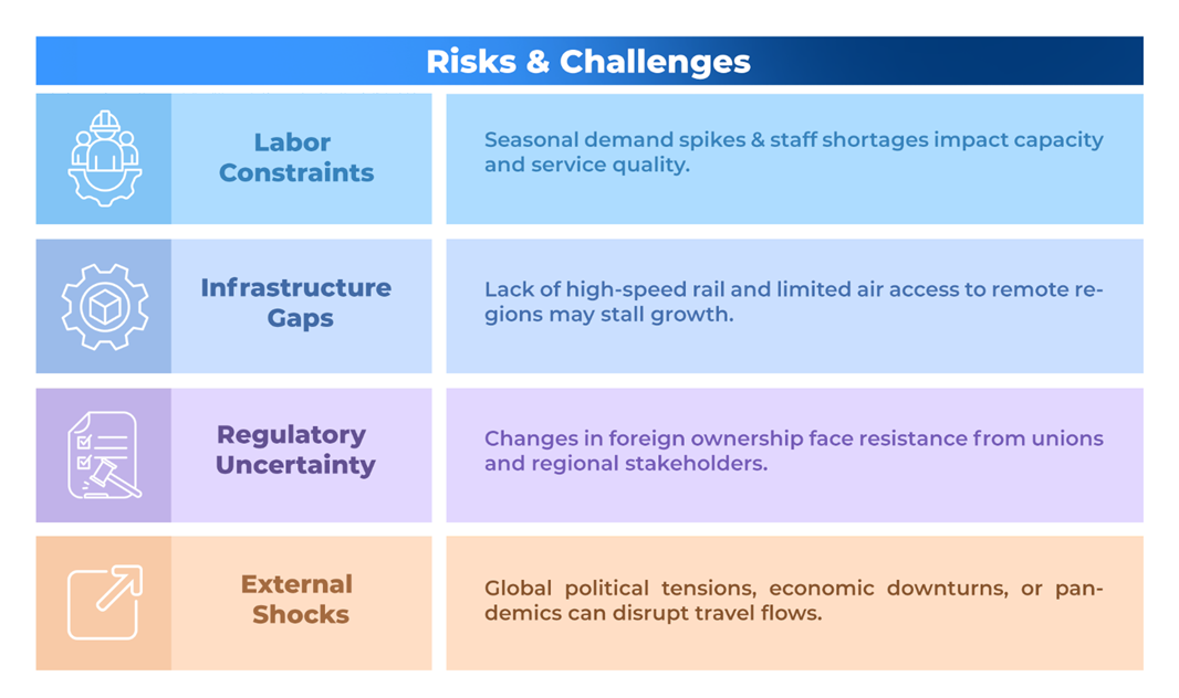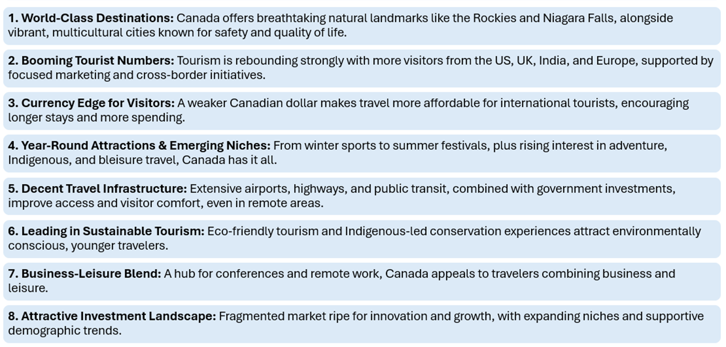 Canada’s travel and leisure industry appears set for steady growth, supported by sustainable local demand, the revival of international arrivals, and favorable government policies. Ongoing improvements in infrastructure, growing consumer interest, and rising focus on eco-friendly and immersive travel experiences are creating attractive prospects for both businesses and investors. That said, challenges such as staffing gaps, rising operational costs, and global economic headwinds will require careful navigation. Despite these hurdles, the sector’s long-term outlook remains optimistic, as Canada continues to enhance its appeal as a top-tier destination in the post-COVID landscape.