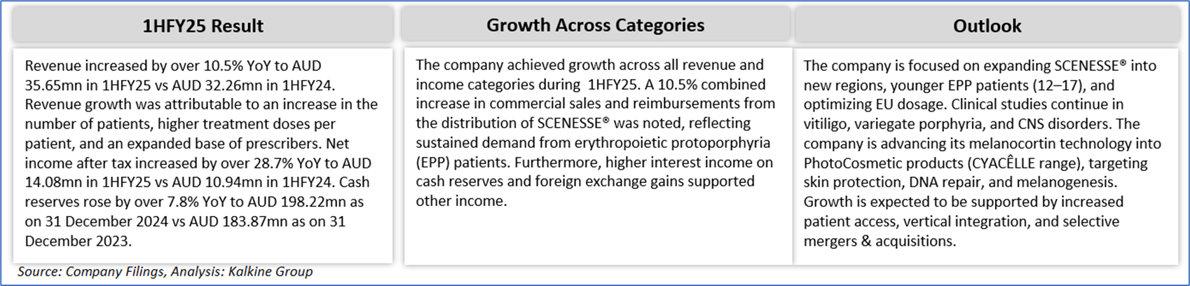 Company Overview: Clinuvel Pharmaceuticals Limited (ASX: CUV) is a Melbourne-based global specialty pharmaceutical company focused on developing and commercialising treatments for patients with genetic, metabolic, systemic, and life-threatening acute disorders. It also provides healthcare solutions for the general population. Its lead therapy, SCENESSE® (afamelanotide 16mg), is a pioneering drug for photoprotection and repigmentation. Kalkine’s Earnings Hunter Report covers the Key Financial Metrics, Risks, Outlook, Technical Analysis along with the earnings hunter score and rating on the stock.