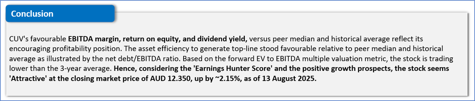 The stock has declined by ~9.82% in the last 9 months, and over the last 1 year, it has decreased by ~12.07%. The stock has a 52-week low and 52-week high of AUD 9.410 and AUD 15.990, respectively, and is currently trading below the 52-week high-low average. CUV was last covered in a report dated ‘30 July 2025’.