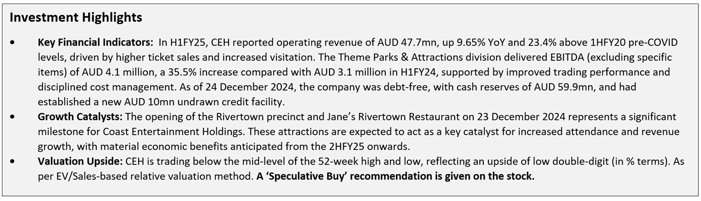 Kalkine’s Global Travel & Leisure Report covers the Investment Highlights, Key Financial Metrics, Risks, Technical Analysis along with the Valuation, Target Price, and Recommendation on Coast Entertainment Holdings Limited (ASX: CEH).