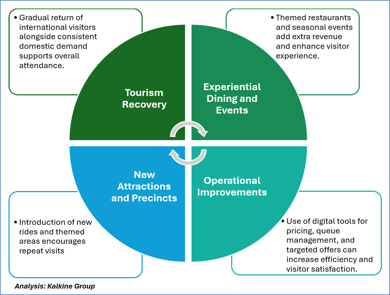 The outlook for Australian theme parks remains positive, supported by steady domestic demand and a gradual return of international visitors. Operators are likely to benefit from new attractions, seasonal events, and enhanced experiences that encourage repeat visits. Revenue growth may also be supported by ticketing bundles, annual passes, and improvements in dining and retail offerings. While cost pressures from labour, energy, and imported ride components may affect margins, overall conditions suggest a continued moderate expansion for the sector over the next few years.