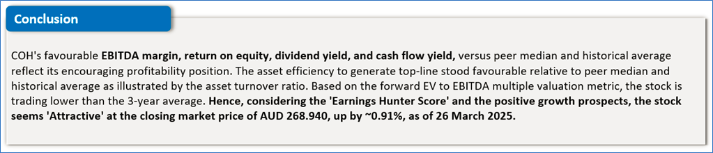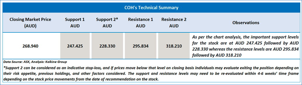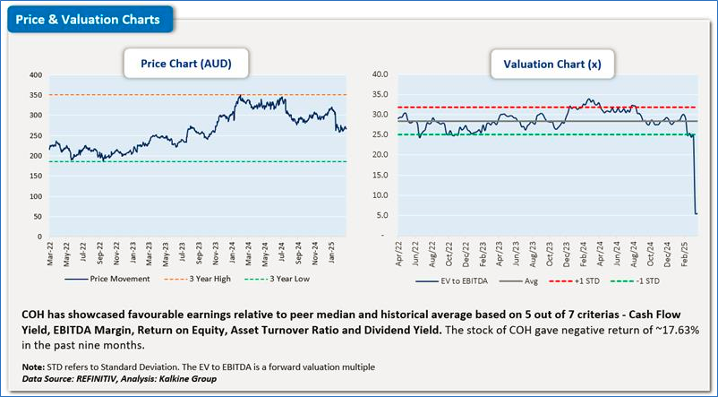 The stock has declined by ~2.42% in the last six months, and over the last nine months, it has decreased by ~17.63%. The stock has a 52-week low and 52-week high of AUD 255.690 and AUD 350.310, respectively, and is currently trading below the 52-week high-low average. COH was last covered in a report dated ‘19 February 2025’.