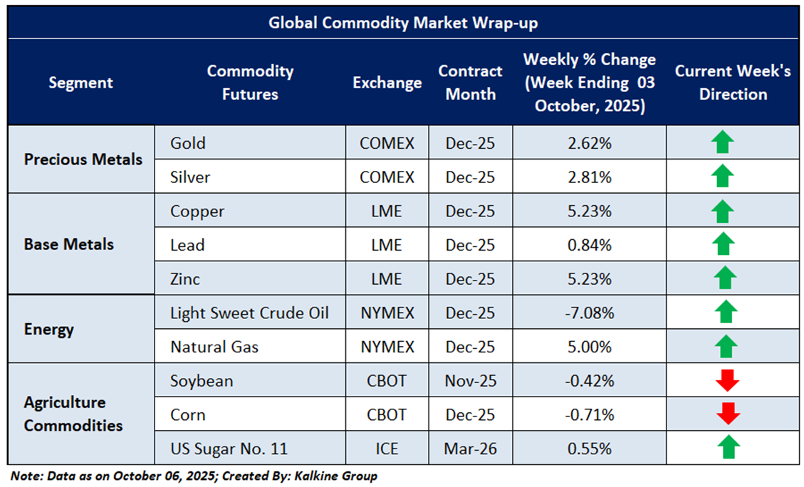 The metals market ended last week on a bullish note, supported by concerns over a potential U.S. government shutdown and political developments in Japan. Gold climbed 2.62% and silver gained 2.81%, while industrial metals also advanced, with copper up 5.23%, lead rising 0.84%, and zinc gaining 5.23%. The rally reflects cautious optimism amid global trade uncertainties, with a focus now on upcoming economic data that may shape near-term market direction and volatility.