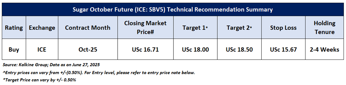 As per the above-mentioned price action and technical indicators analysis, Sugar October Future (ICE: SBV5) is looking technically well-placed for a ‘Buy’ rating. Investment decisions should be made depending on an individual’s appetite for downside potential, risks, and any previous holdings. This recommendation is purely based on technical analysis, and fundamental analysis has not been considered in this report. Technical summary of the ‘Buy’ recommendation is as follows: