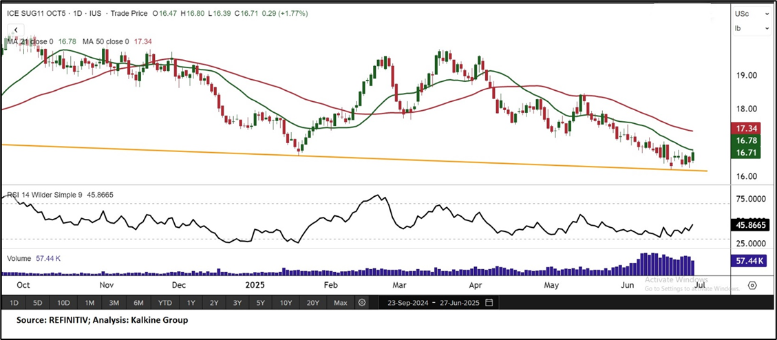 Price Action and Technical Indicator Analysis: October Sugar futures exhibit bullish undertones, trading above a descending trendline and supported by a bullish candlestick pattern that reflects sustained positive sentiment. The 50-period Simple Moving Average, positioned above the current market price, provides a reliable support base in the short term. The RSI at 45.86 signals stable momentum, with the potential for bullish divergence strengthening the outlook. This setup suggests a constructive near-term trend, where a breakout above immediate resistance levels could trigger a fresh upside. Steady support zones may also encourage healthy consolidation, maintain the broader upward bias and opening room for potential gains ahead.