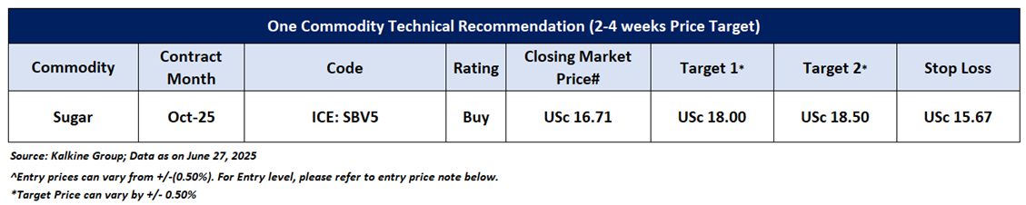 Having understood the global commodities’ performance over the past week, taking cues from major global economic events, and based on technical analysis, noted below is the recommendation with generic insights, entry price, target prices, and stop-loss Sugar October Future (ICE: SBV5) for the next 2-4-week duration: