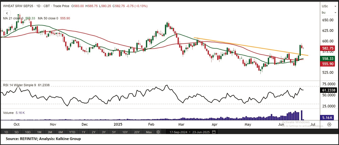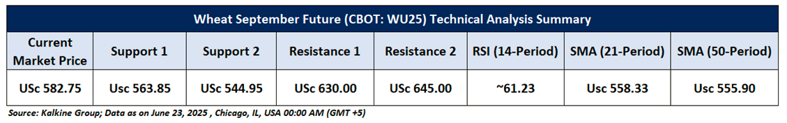 Price Action and Technical Indicator Analysis: September Wheat futures continue to display bullish resilience, trading above a descending trendline and the 21-period Simple Moving Average, reflecting sustained positive sentiment. The 50-period SMA provides a strong support base, further reinforcing the prevailing uptrend. The Relative Strength Index (RSI) stands at 61.23, indicating steady momentum, while the possibility of a bullish divergence adds to the optimism. This technical configuration points to a constructive near-term outlook. A breakout above immediate resistance levels could confirm the onset of a new bullish phase. Meanwhile, consistent support may lead to healthy consolidation, keeping the overall bias upward with the potential for further gains.