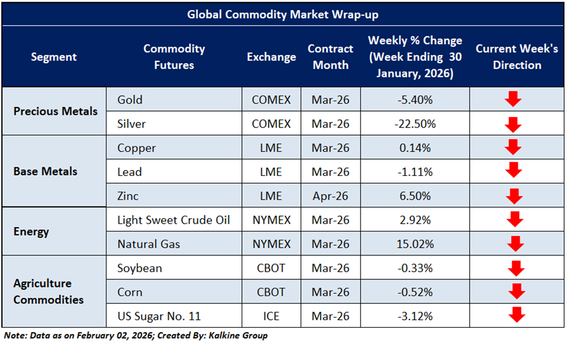 Global commodities ended the week on a mixed and cautious note, marked by sharp corrections in precious metals and selective strength in base metals. Gold fell 5.40%, and silver slumped 22.50%, as aggressive profit-taking followed recent rallies amid rising policy uncertainty. In contrast, base metals exhibited uneven performance, with copper rising 0.14% and zinc surging 6.50%, while lead declined 1.11%, reflecting mixed industrial demand conditions. Overall sentiment remained guarded, with markets turning data-dependent ahead of the upcoming U.S. non-farm payrolls and key macroeconomic releases.