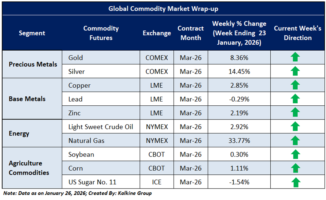 Global commodities ended the week on a mixed but cautious footing, with gains concentrated in select metals rather than broad-based strength. Precious metals outperformed, as gold rose 8.36% and silver surged 14.45%, supported by safe-haven positioning amid elevated policy uncertainty. Base metals exhibited divergent trends, with copper rising 2.85% and zinc increasing by 2.19%, while lead declined by 0.29%, reflecting uneven industrial demand. Overall sentiment remained guarded, with markets awaiting the upcoming U.S. rate decision and key economic data for clearer near-term direction.