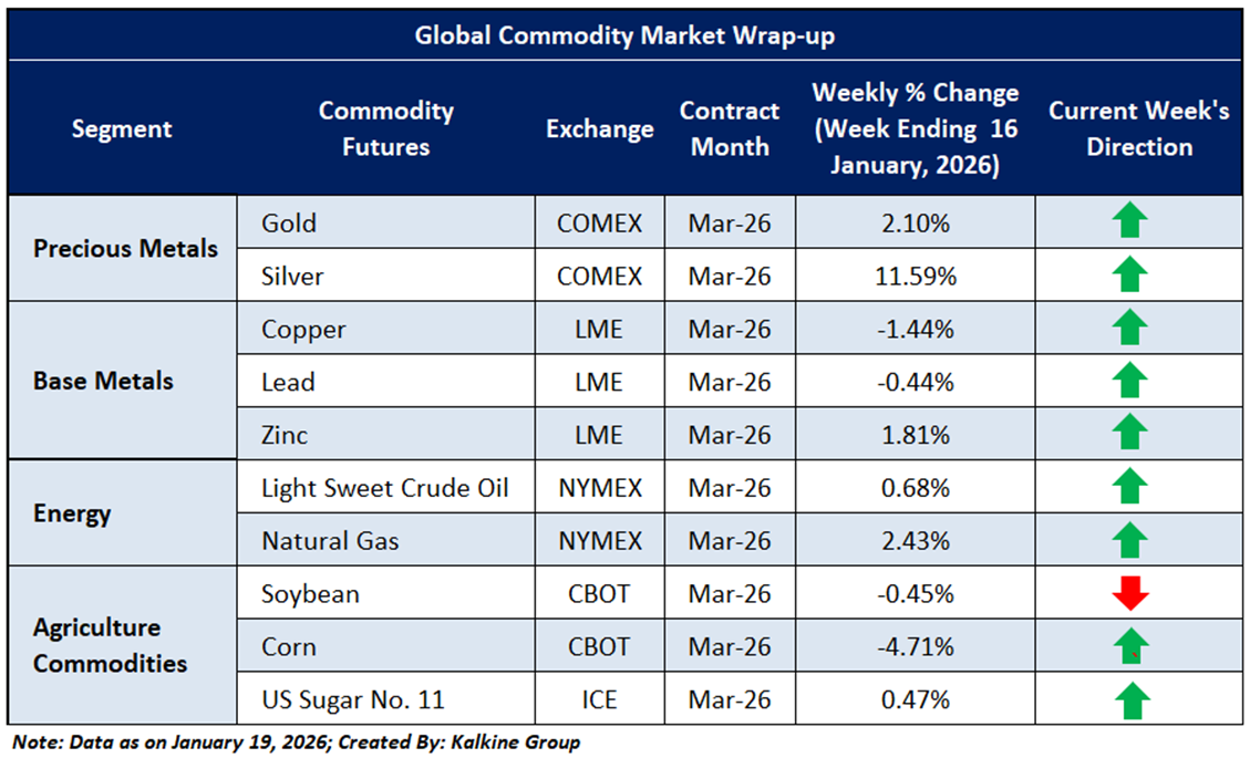 Global commodities ended the week on a mixed note with a mild positive bias, supported mainly by selective strength in metals. Precious metals outperformed, with gold rising 2.10% and silver surging 11.59%, driven by safe-haven positioning amid elevated policy uncertainty. Base metals showed divergent performance, as copper slipped 1.44%, lead eased 0.44%, while zinc advanced 1.68%, reflecting uneven but generally steady industrial demand conditions. Overall sentiment remained cautious yet constructive, with market attention turning to upcoming U.S. GDP data for clearer near-term direction.