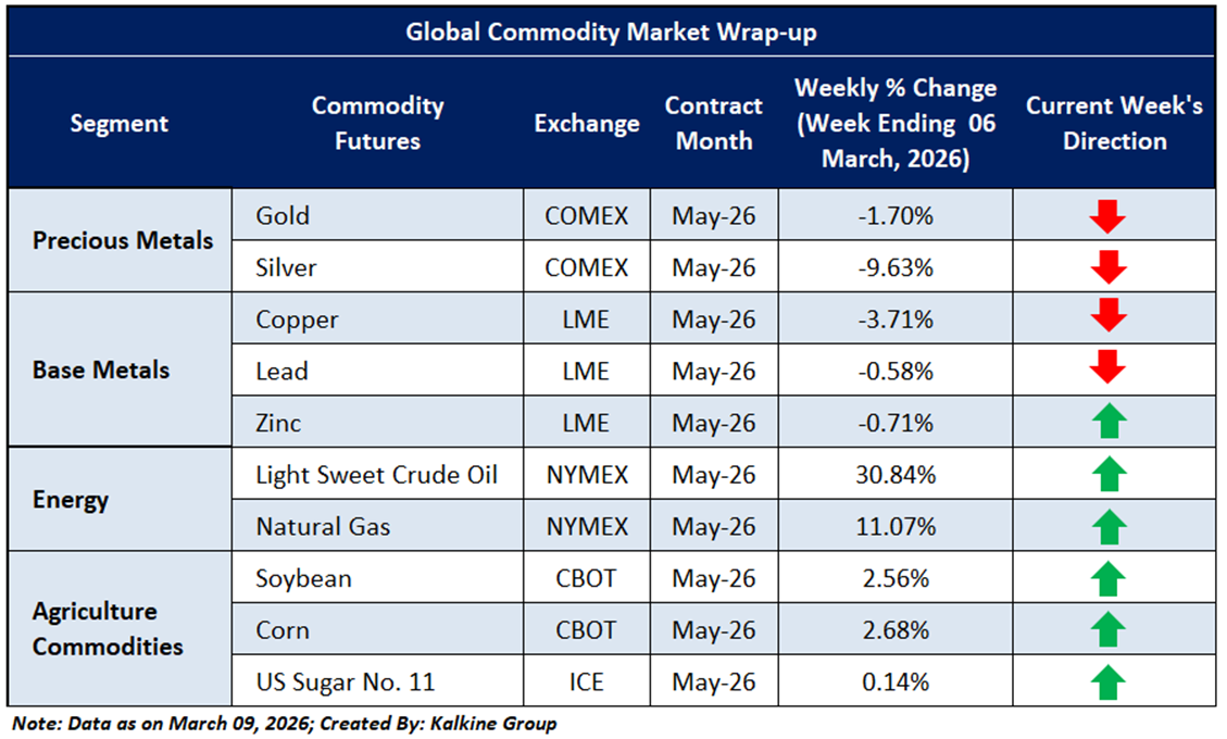 Energy markets showed strong upward momentum during the week, led by natural gas which surged 11.07% as supply concerns intensified and geopolitical tensions in the Middle East pushed prices higher. Crude oil also rallied sharply, gaining 30.84%, supported by heightened geopolitical risks and tighter supply expectations. In agricultural commodities, U.S. sugar edged down 0.14%, reflecting relatively soft demand signals. Overall, commodity markets remained mixed, with energy prices rising sharply while other segments stayed relatively subdued, as investors continued to track geopolitical developments and key macroeconomic indicators.