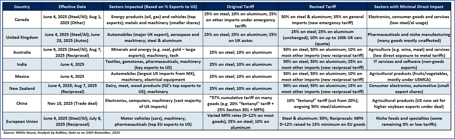 As illustrated in the table below, several key sectors in different countries are directly impacted by the recent tariff announcement from President Trump.