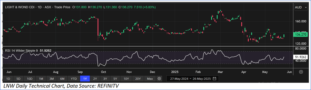 The stock has witnessed a correction of ~14.83% in last three months, and over the past one year, it decreased by ~4.53%. The stock has a 52-week low and 52-week high of AUD 122.00 and AUD 181.250, respectively, and is currently trading below the 52-week high-low average. LNW was last covered in a report dated ‘24 June 2024’.