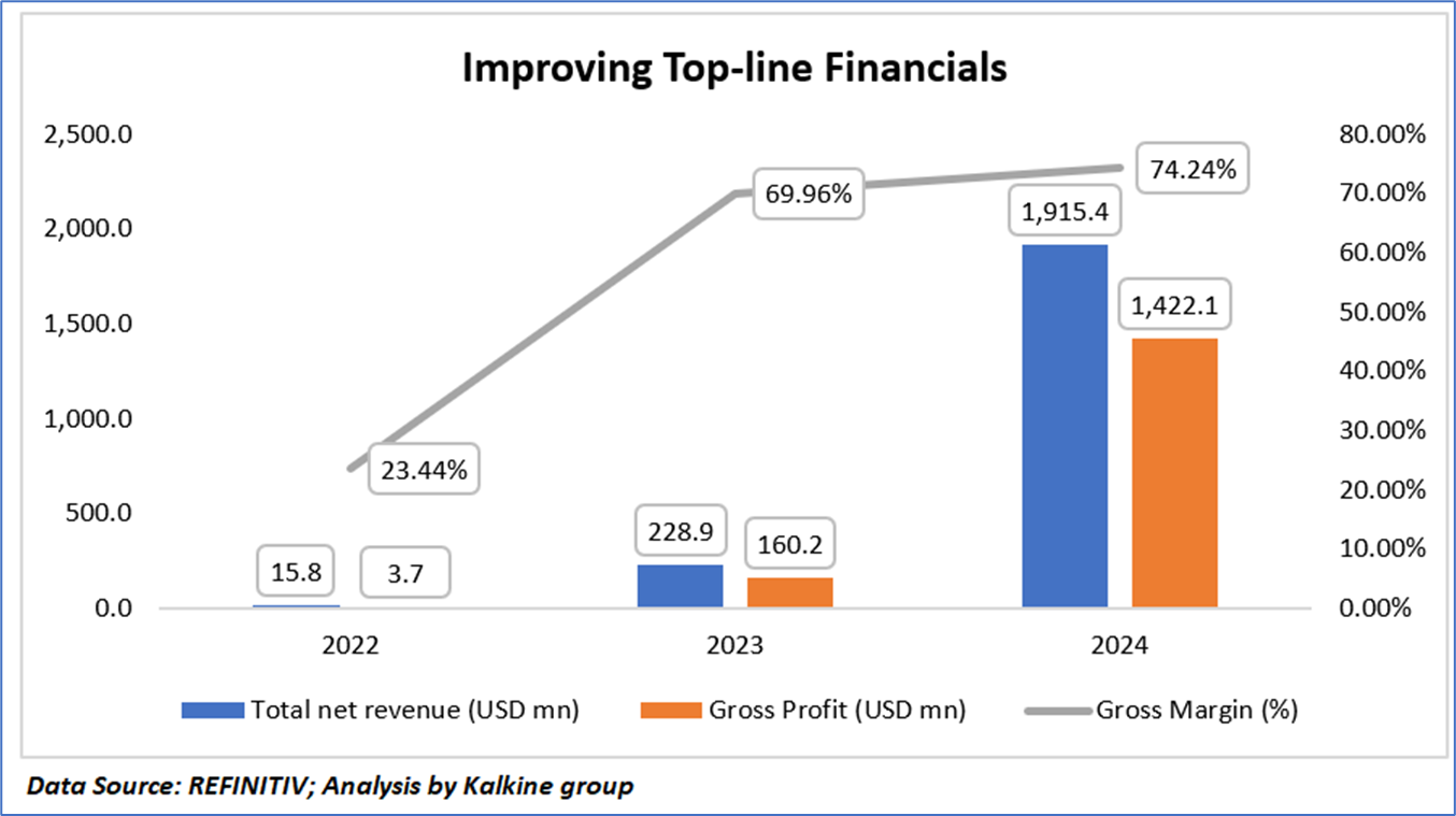 CoreWeave, Inc. (Nasdaq: CRWV) demonstrated remarkable financial progression from 2022 to 2024, with total net revenue escalating from USD 15.8 million to USD 228.9 million and further to USD 1,915.4 million, reflecting explosive year-over-year growth rates of approximately 1,349% from 2022 to 2023 and 737% from 2023 to 2024, driven by surging demand for its AI hyperscale cloud services and strategic expansions in infrastructure and customer acquisitions. Concurrently, gross profit surged from USD 3.7 million to USD 160.2 million and USD 1,422.1 million over the same periods, underscoring enhanced operational efficiency, while gross margins improved substantially from 23.44% to 69.96% and 74.24%, attributable to economies of scale, optimized cost structures in data center deployments, and a shift toward higher-margin AI workloads, positioning the company for sustained profitability amid a supply-constrained market.