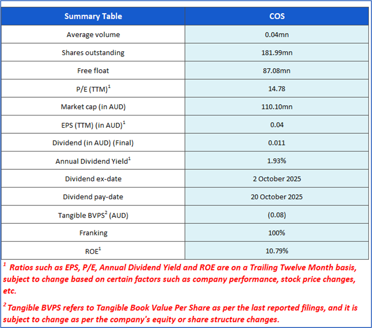 The stock price has gone down by ~27.9% in the last six months and over the last nine months, stock prices declined by ~39.8%. The stock has a 52-week low and 52-week high of AUD 0.455 and AUD 1.090, respectively, and is currently trading below the mid-range of the 52-week-high-low levels. COS was last covered in a report dated ’18 November 2022’.