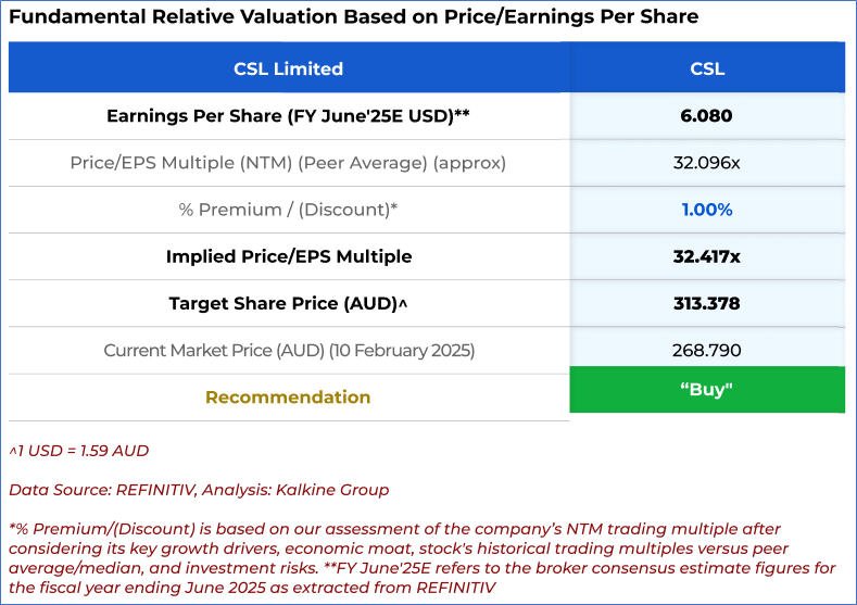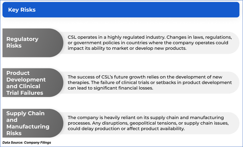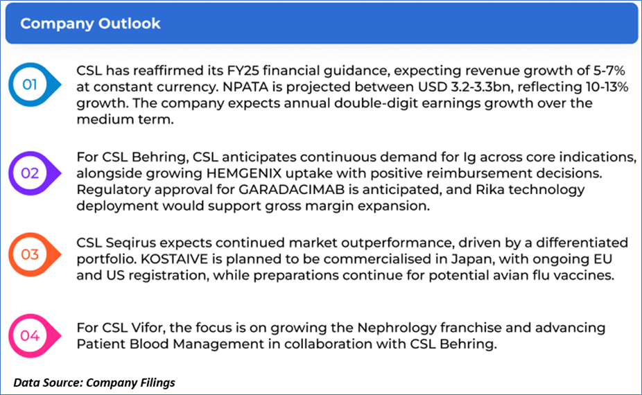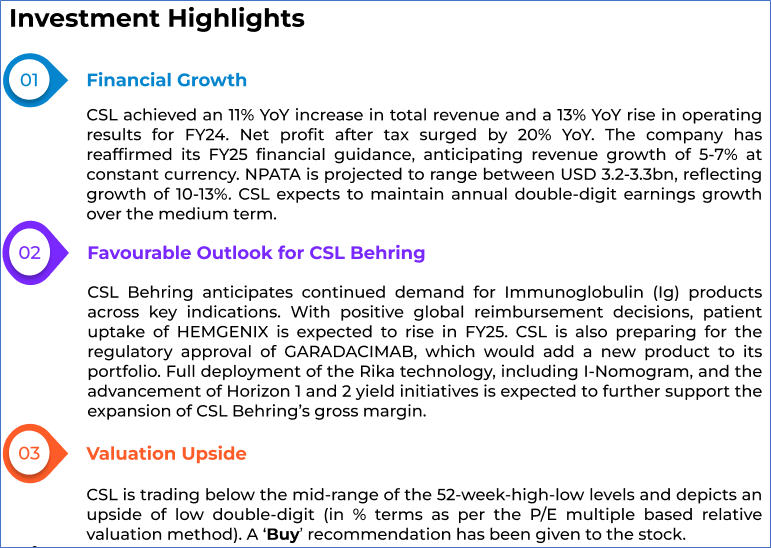 1.1: Company Overview: CSL Limited (ASX: CSL) is engaged in the research, development, manufacturing, marketing and distribution of biopharmaceutical products and vaccines. The ASX-listed biotechnology company includes three businesses, CSL Behring, CSL Seqirus and CSL Vifor. The company delivers innovative life-saving medicines in more than 100 countries. Kalkine’s Investor Report covers the Investment Highlights, Management Insights, Key Financial Metrics, Risks, Technical Analysis along with the Valuation, Target Price, and Recommendation on the stock.