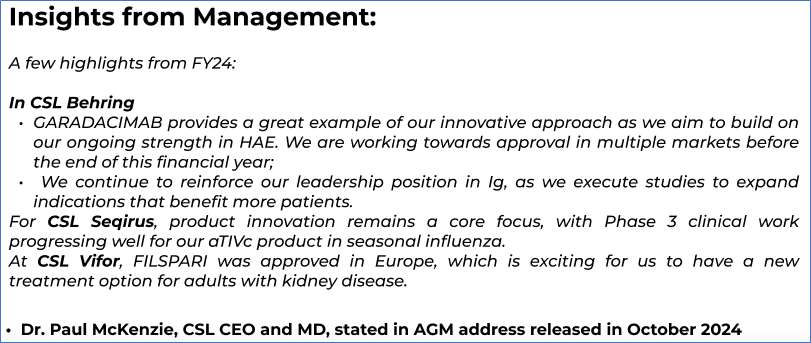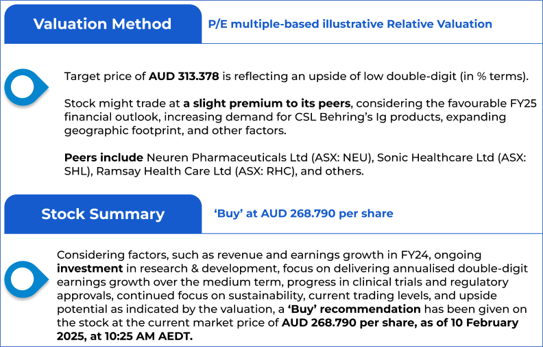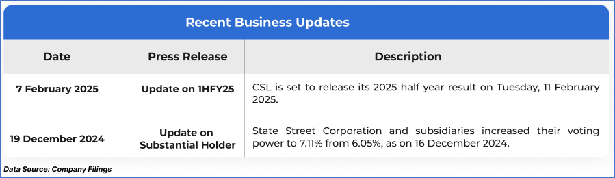 The stock price has gone down by ~5.72% in the last one month and over the last 6 months, stock prices went down by ~12.99%. The stock has a 52-week low and 52-week high of AUD 265.140 and AUD 313.550, respectively, and is currently trading below the mid-range of the 52-week-high-low levels. CSL was last covered in a report dated ‘20 December 2024’.