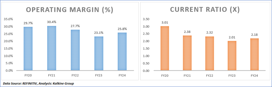 1.4: Key Metrics: CSL registered an asset turnover ratio of 0.40x in FY24 compared with the industry median of 0.34x. Below is captured the metrics showing the trend of operating margin and current ratio since FY20: