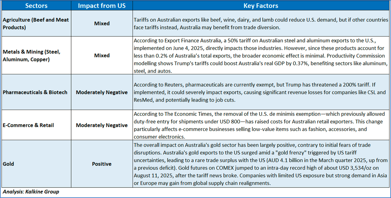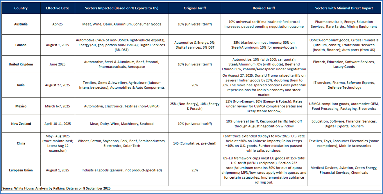 As illustrated in the table below, several key sectors in different countries are directly impacted by the recent tariff announcement from President Trump.
