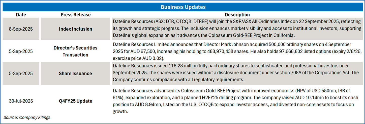 Company Overview: Dateline Resources Limited (ASX: DTR) is an Australian-based mining and exploration company headquartered in Sydney. The company focuses on the exploration and development of mineral properties across North America, with a primary emphasis on gold, rare earth elements, copper, and strontium. Kalkine’s Global Tariff Report covers the Investment Highlights, Key Financial Metrics, Risks, and Technical Analysis along with the Target Price, and Recommendation on the stock.