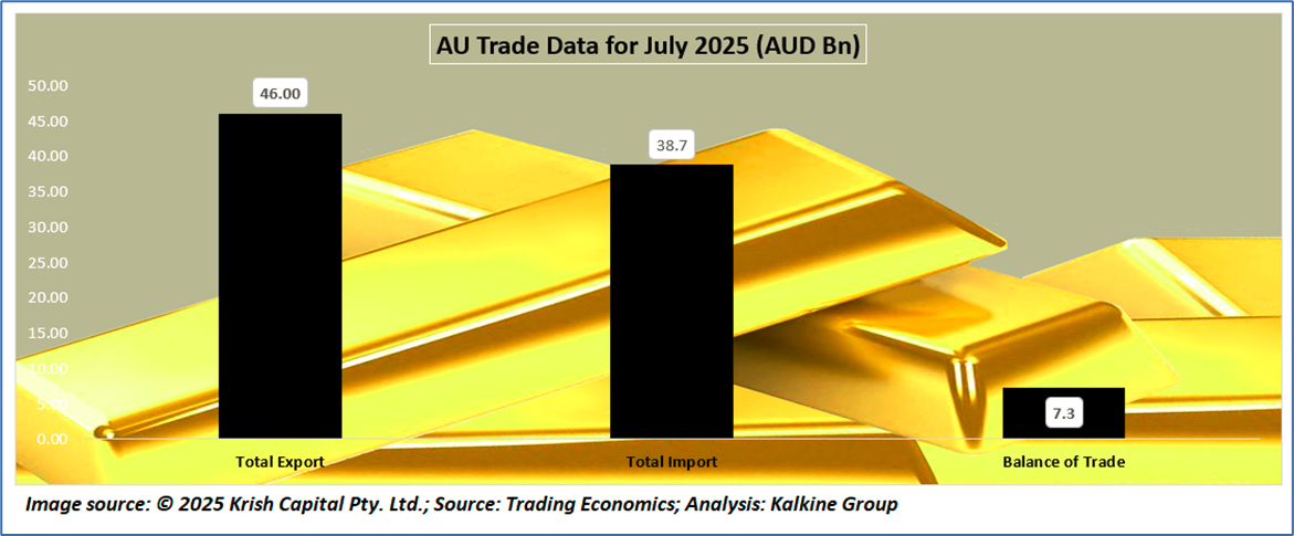 Australia’s external sector data shows mixed trends. In July 2025, the trade surplus widened to AUD 7.31 billion, supported by exports rising to AUD 46.0 billion while imports eased to AUD 38.7 billion. The June 2025 current account deficit narrowed slightly to AUD 13.7 billion, equal to -2% of GDP, while external debt stood at AUD 2.68 trillion. Terms of trade softened to 114 points, and capital inflows increased to AUD 17.7 billion. Foreign direct investment surged to AUD 81.0 billion in December 2024. Meanwhile, tourist arrivals improved to 624,510 in June 2025, and gold reserves remained stable at 79.9 tonnes.