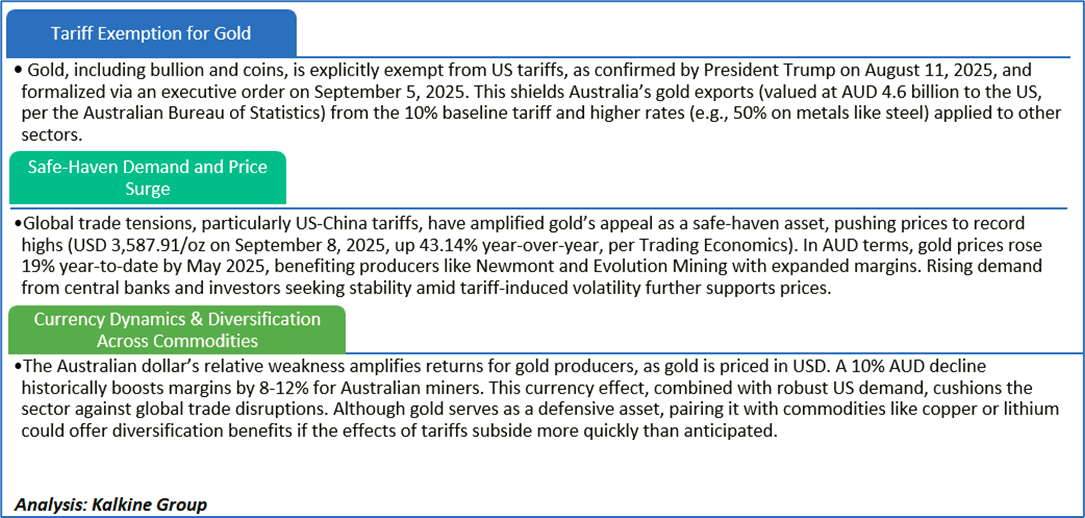 As of September 8, 2025, the US under President Trump has imposed tariffs on Australian goods, including a 10% baseline from April 9 and higher rates of up to 50% on metals such as steel, aluminum, and copper under Section 232. Gold, however—including bullion, coins, and certain energy-related products—was explicitly exempted on August 11, 2025, with Trump designating it a strategic asset outside the broader tariff framework.
