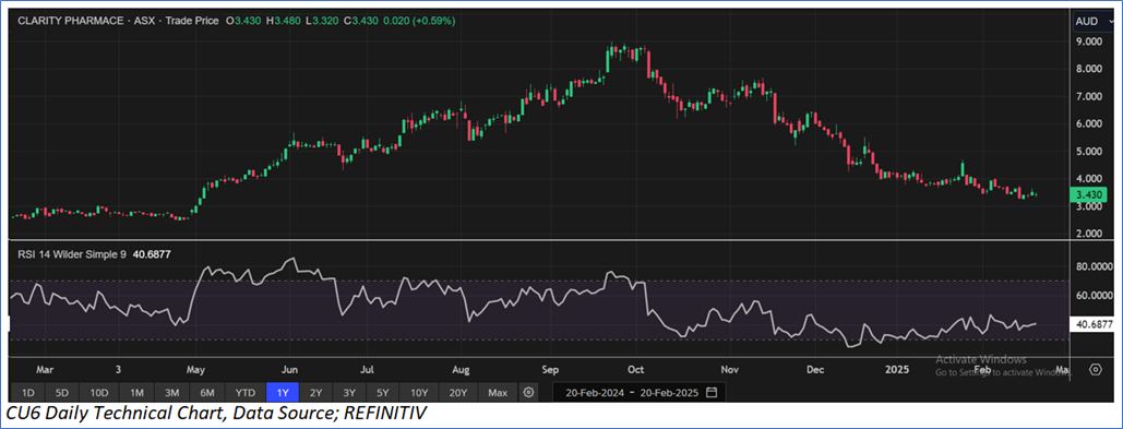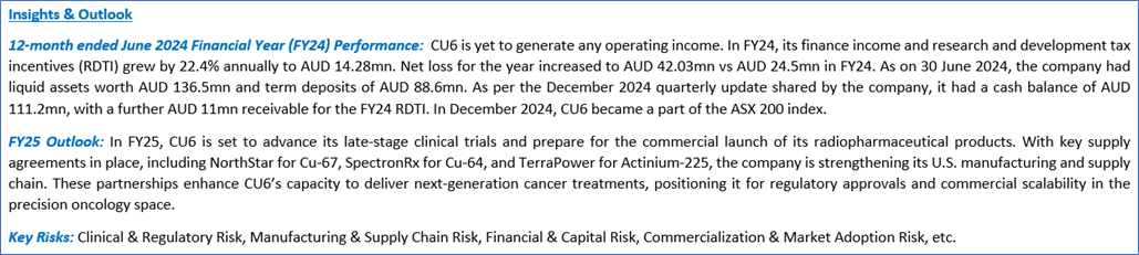 The stock has witnessed a correction of ~42.55% in last three months, and over the past six months, it has decreased by ~50.22%. The stock has a 52-week low and 52-week high of AUD 2.492 and AUD 8.975, respectively and is currently trading below the 52-week high-low average. CU6 was last covered in a report dated ‘9 January 2025’.