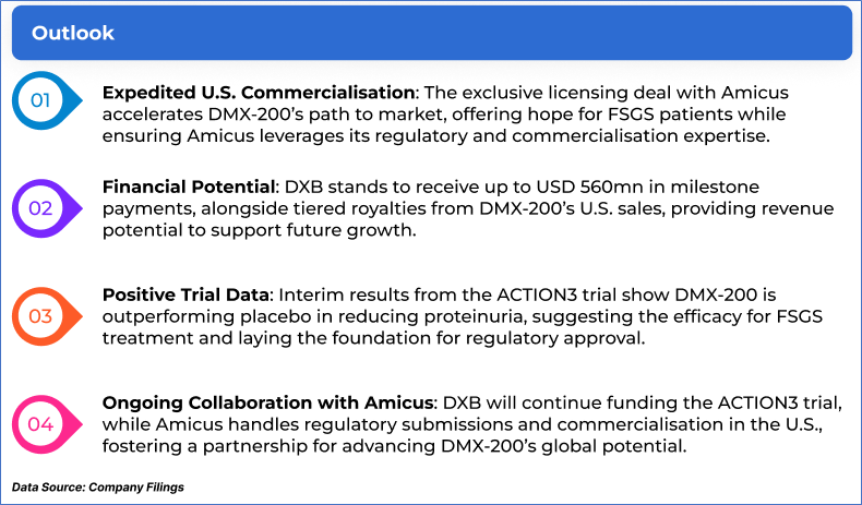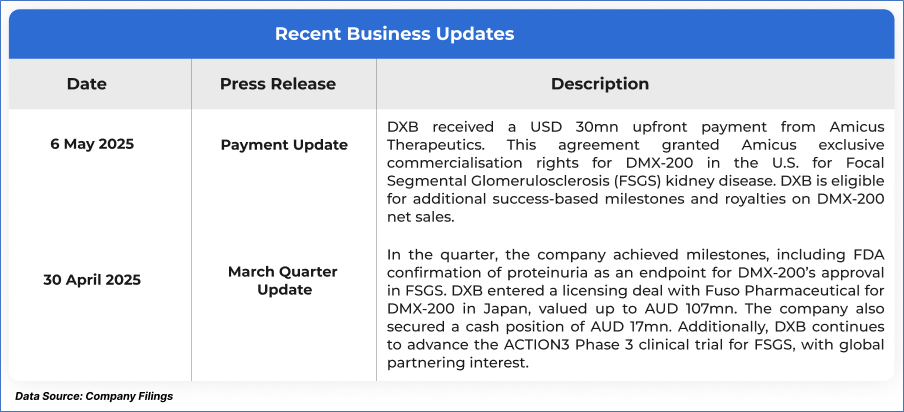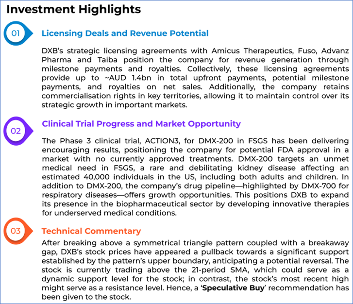 1.1: Company Overview: Dimerix Limited (ASX: DXB) is a clinical-stage biopharmaceutical company developing treatments for inflammatory diseases, with a focus on kidney and respiratory conditions. Its lead candidate, DMX-200, is in Phase 3 trials for Focal Segmental Glomerulosclerosis (FSGS), while DMX-700 targets respiratory disease. Both candidates were discovered using Receptor-HIT, Dimerix’s proprietary drug discovery platform. Kalkine’s Healthcare Report covers the Investment Highlights, Management Insights, Key Financial Metrics, Risks, Technical Analysis along with the Valuation, Target Price, and Recommendation on the stock.