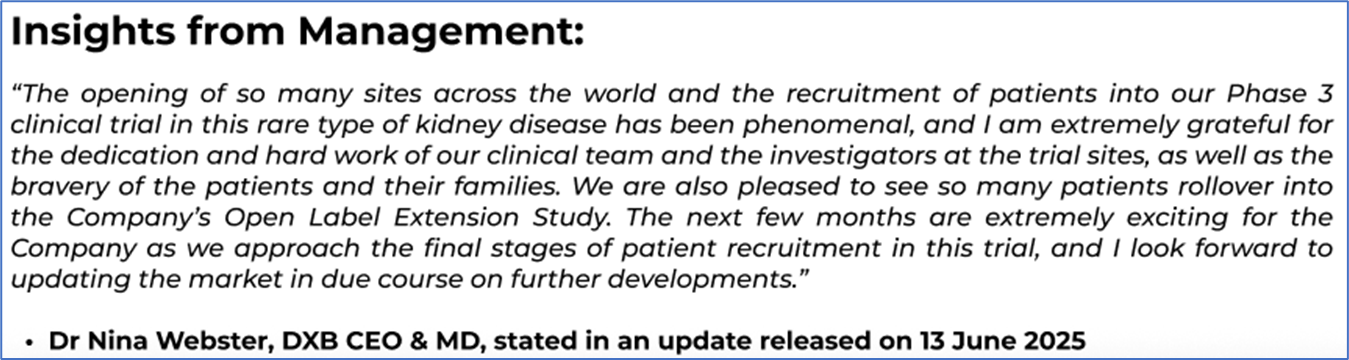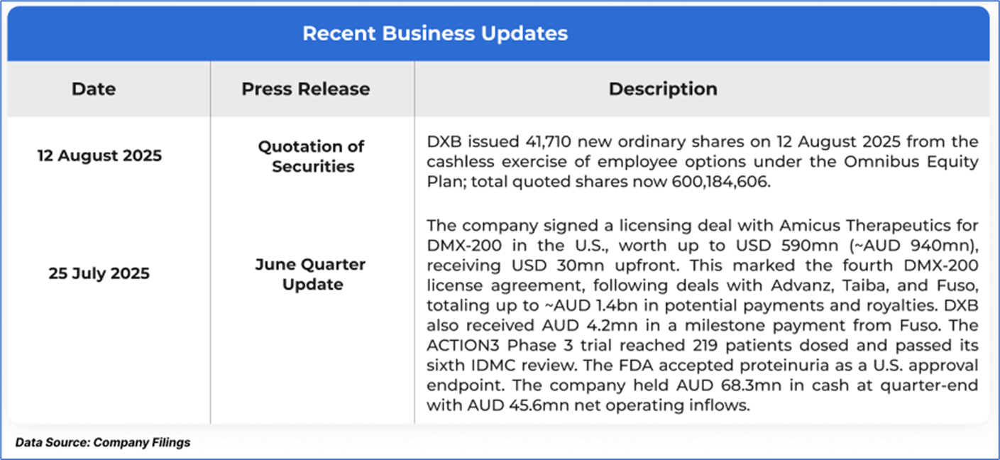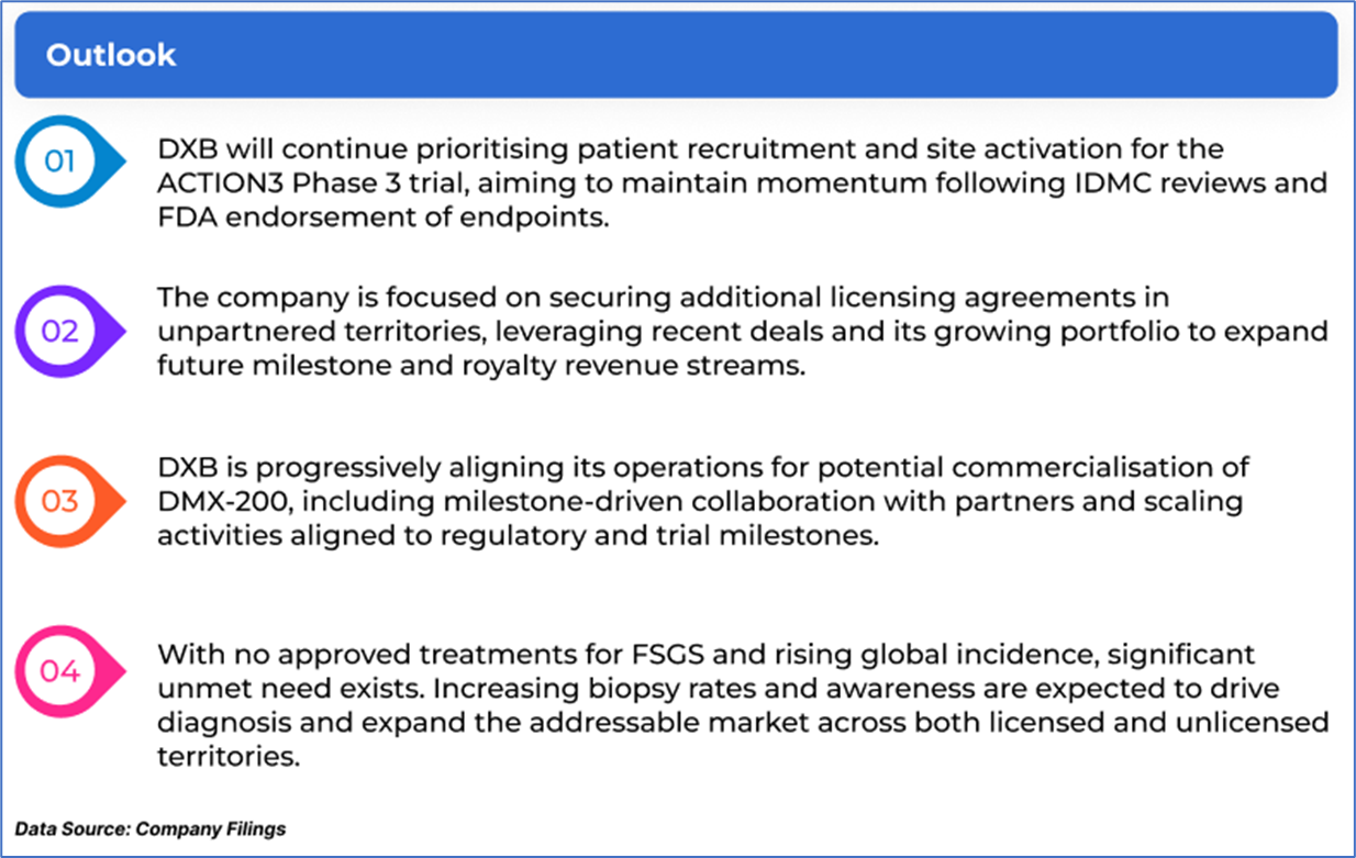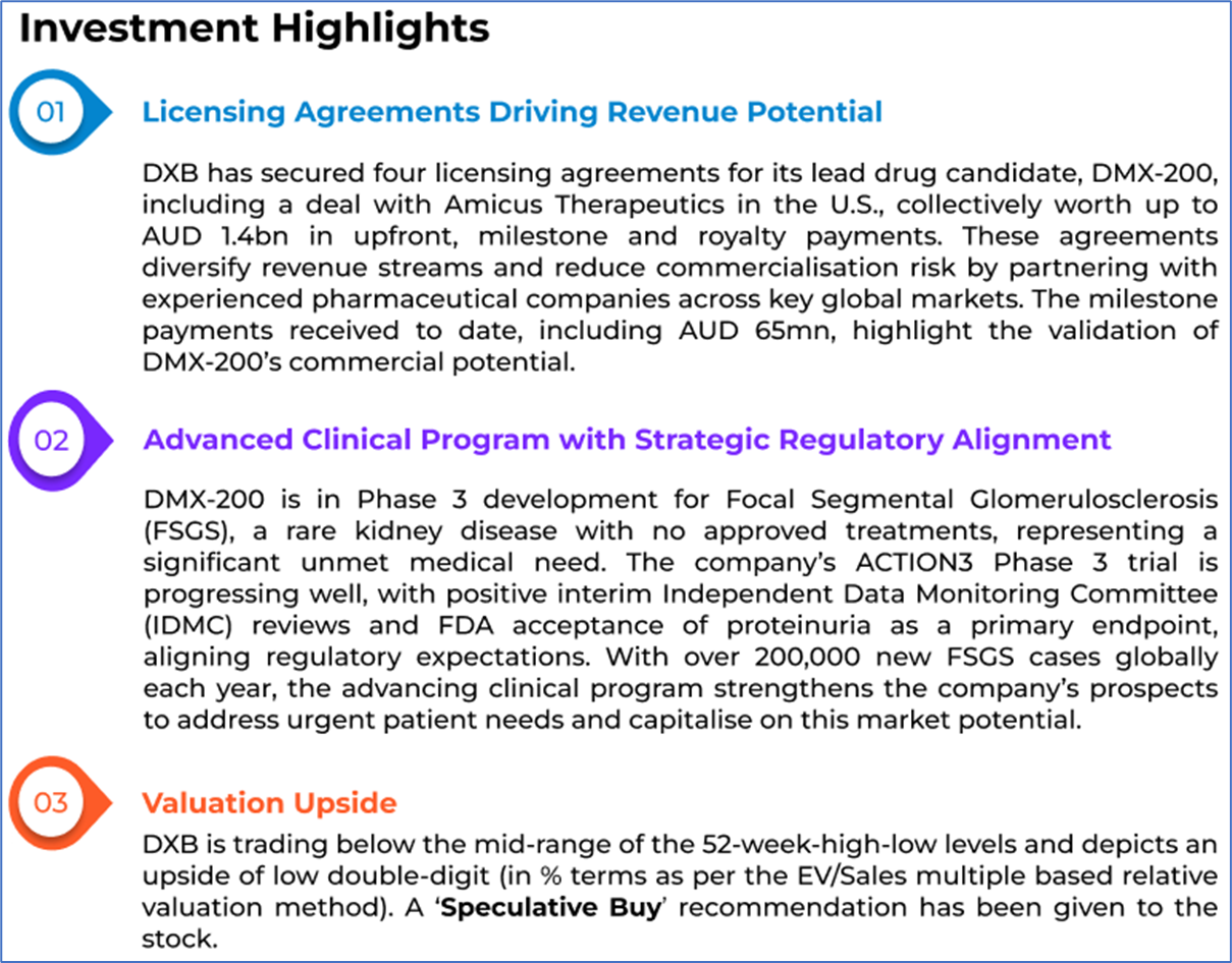 1.1: Company Overview: Dimerix Limited (ASX: DXB) is a clinical-stage biopharmaceutical company developing treatments for inflammatory diseases, with a focus on kidney and respiratory conditions. Its lead candidate, DMX-200, is in Phase 3 trials for Focal Segmental Glomerulosclerosis (FSGS), while DMX-700 targets respiratory disease. Both candidates were discovered using Receptor-HIT, Dimerix’s proprietary drug discovery platform. Kalkine’s Healthcare Report covers the Investment Highlights, Management Insights, Key Financial Metrics, Risks, Technical Analysis along with the Valuation, Target Price, and Recommendation on the stock.