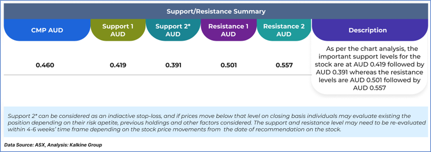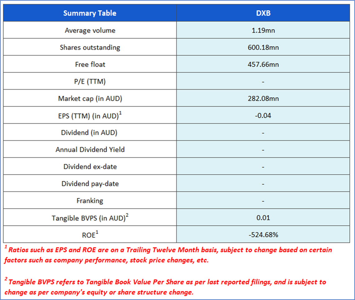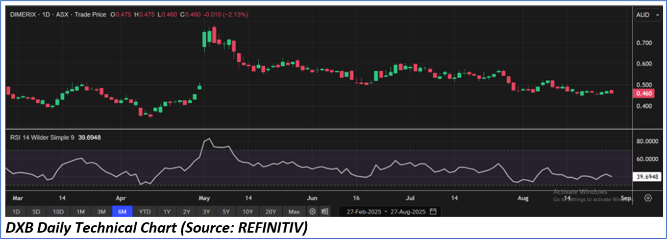 The stock price has gone down by ~15.45% in the last one month and over the last six months, stock prices jumped ~1.09%. The stock has a 52-week low and 52-week high of AUD 0.300 and AUD 0.785, respectively, and is currently trading below the mid-range of the 52-week-high-low levels. DXB was last covered in a report dated ’18 June 2025’.