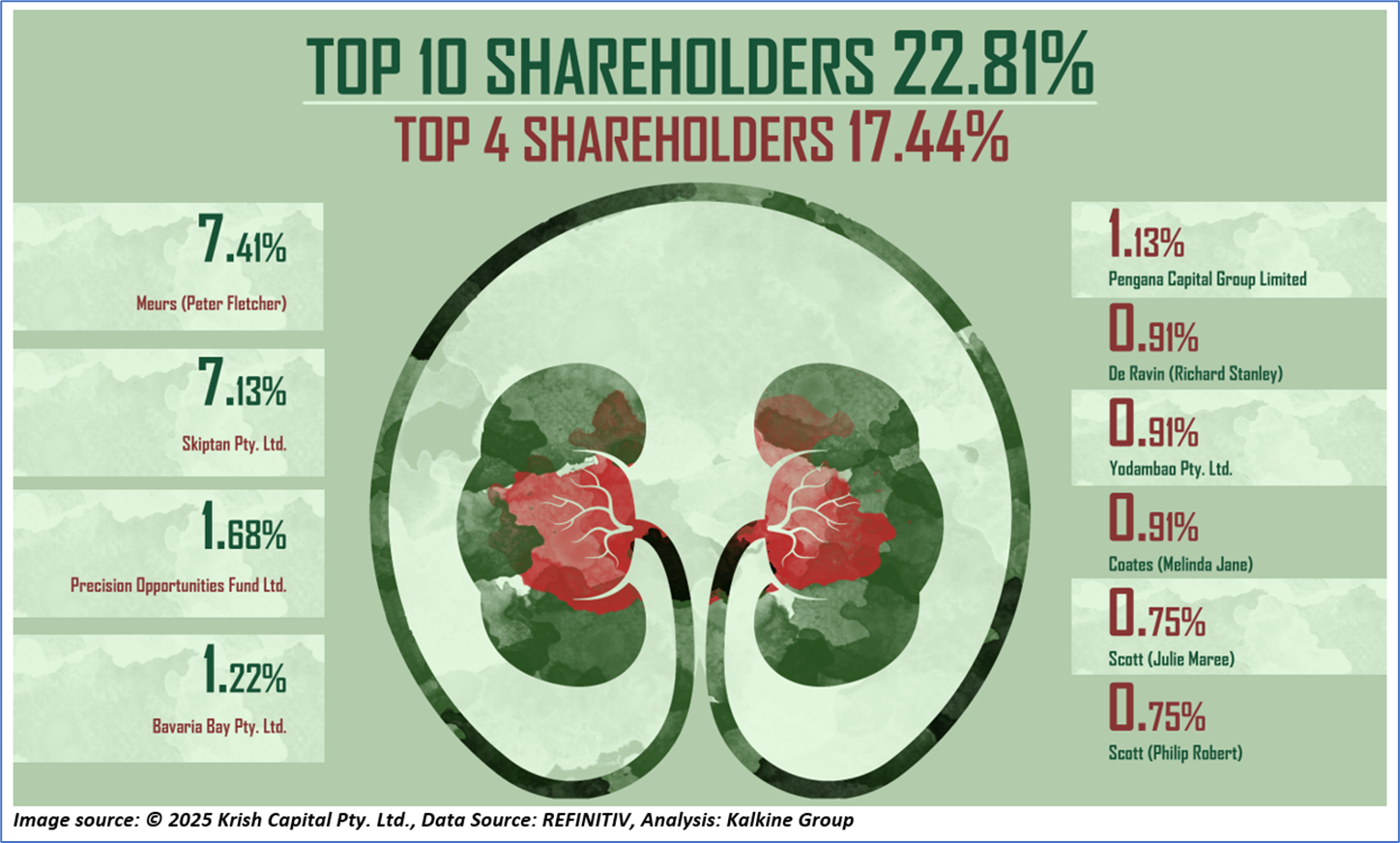 1.3: Top 10 Shareholders: The top 10 shareholders together form ~22.81% of the total shareholding. Meurs (Peter Fletcher) and Skiptan Pty. Ltd. are holding maximum stakes in the company at ~7.41% and ~7.13%, respectively.