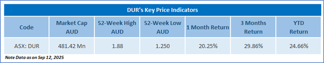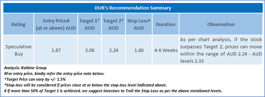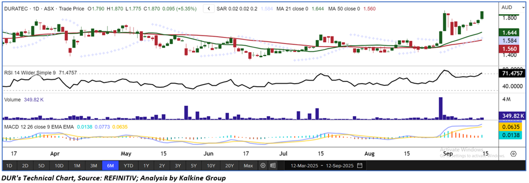 As per the above-mentioned price action and technical indicators analysis, a ‘Speculative Buy’ rating has been given on Duratec Limited (ASX: DUR) at closing price of AUD 1.87 as on Sep 12, 2025.