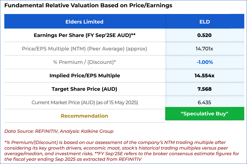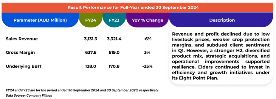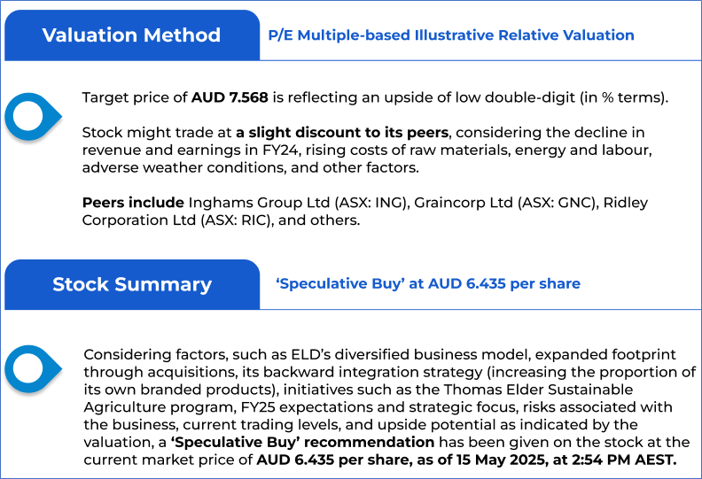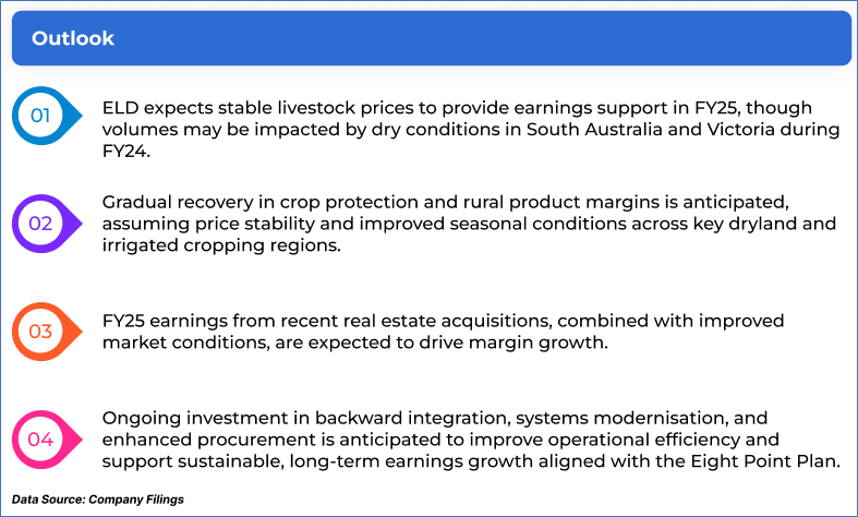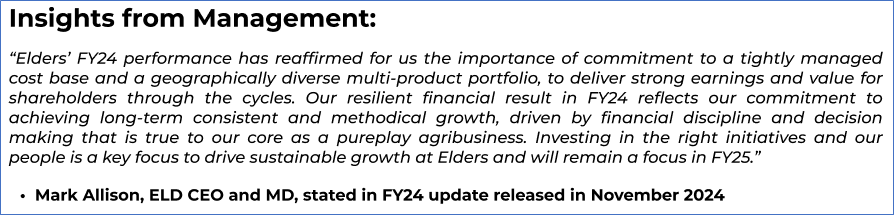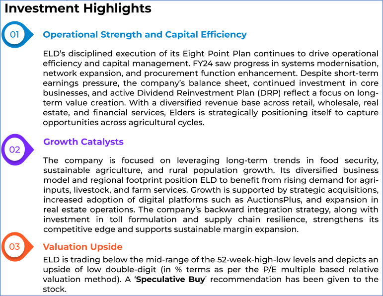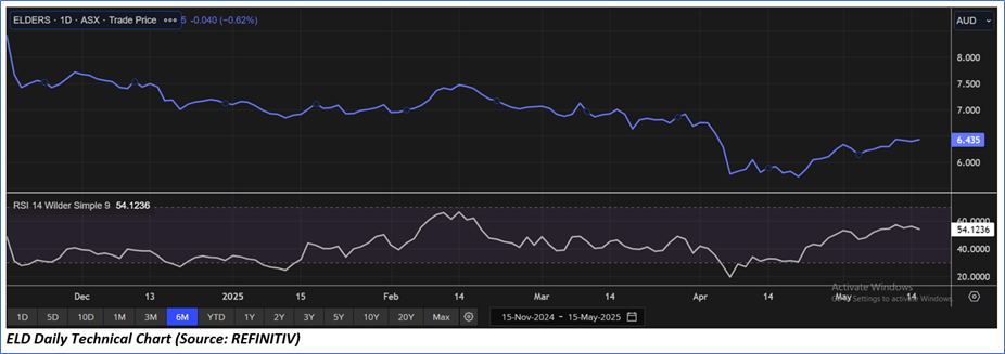 1.1: Company Overview: Elders Limited (ASX: ELD) is an Australian agribusiness offering rural retail and wholesale products, livestock and wool agency services, and real estate solutions. The company also provides digital trading platforms, financial services, and operates in agricultural chemical formulation and cattle feedlotting. With its regional presence, Elders focuses on integrated services and strategic investments to support rural and agribusiness customers. Kalkine’s Dividend Income Report covers the Investment Highlights, Management Insights, Key Financial Metrics, Risks, Technical Analysis along with the Valuation, Target Price, and Recommendation on the stock.