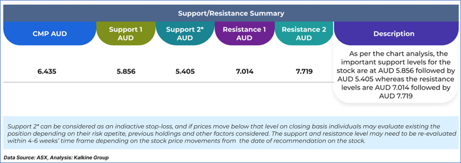 The stock price has gone up by ~8.50% in the last one month and over the last six months, stock prices declined by ~24.35%. The stock has a 52-week low and 52-week high of AUD 5.730 and AUD 9.600, respectively, and is currently trading below the mid-range of the 52-week-high-low levels.