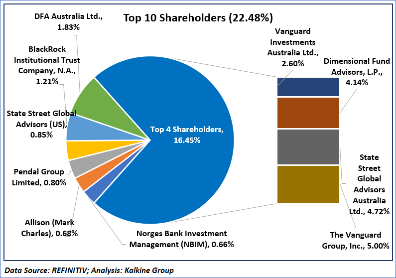 1.3: Top 10 Shareholders: The top 10 shareholders together form ~22.48% of the total shareholding. The Vanguard Group, Inc. and State Street Global Advisors Australia Ltd. are holding maximum stakes in the company at ~5.00% and ~4.72%, respectively.