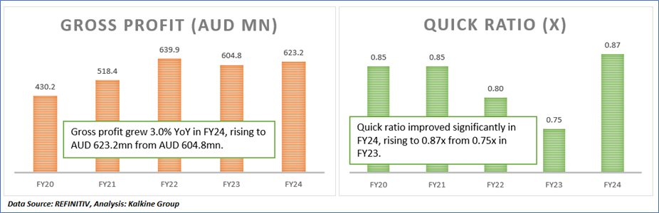 The company registered a fixed asset turnover ratio of 10.27x in FY24 compared with the industry median of 3.34x. Below is captured the metrics showing the trend of gross profit and quick ratio since FY20: