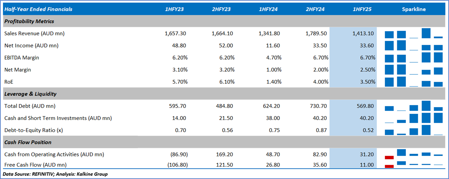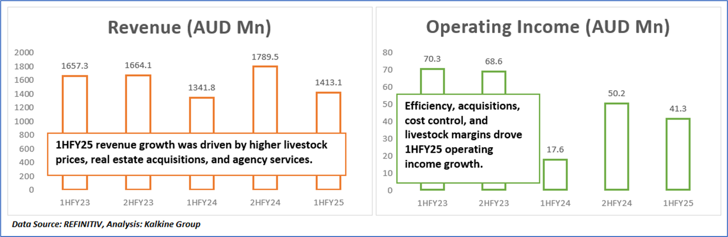 1.4: Key Metrics: Elders announced an interim dividend of 18 cents per share for the six months ended 31 March 2025. The dividend, 50% franked, was paid on 27 June 2025. The company targets a dividend payout ratio between 40% and 60%. The company registered a return on equity of 3.5% in 1HFY25 compared with 1.4% in 1HFY24. Below is captured the metrics showing the trend of revenue and operating income since 1HFY23: