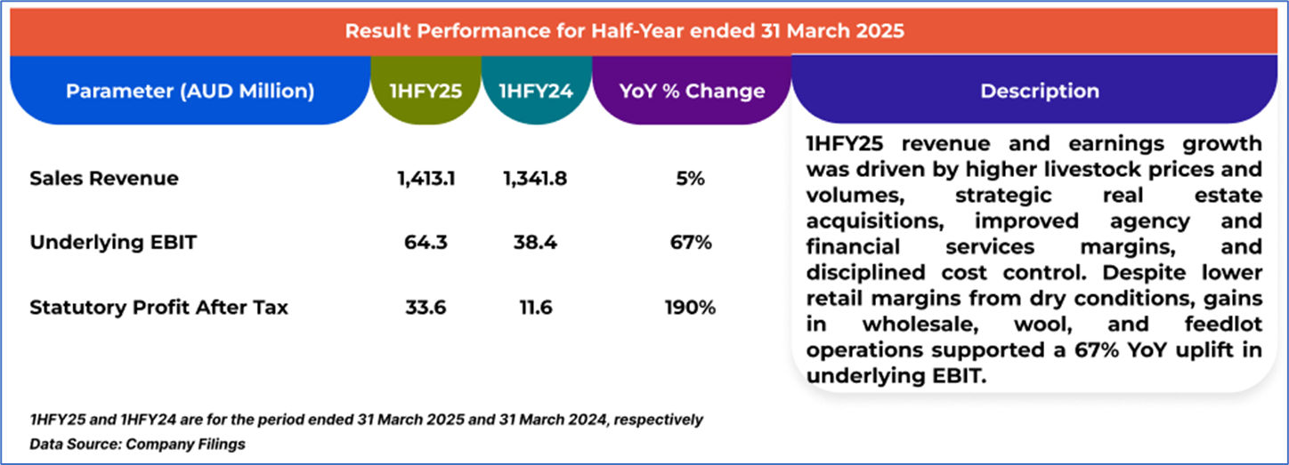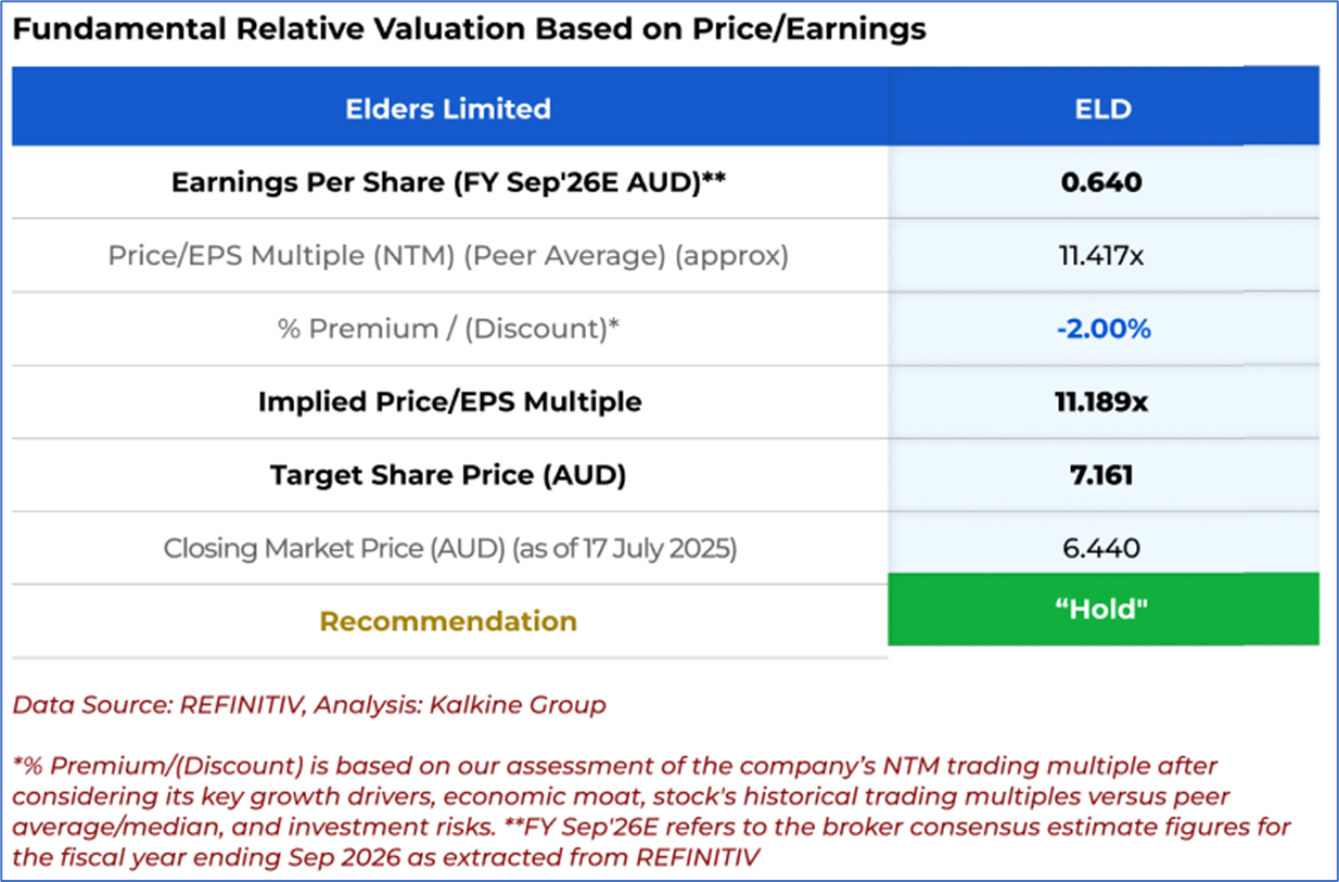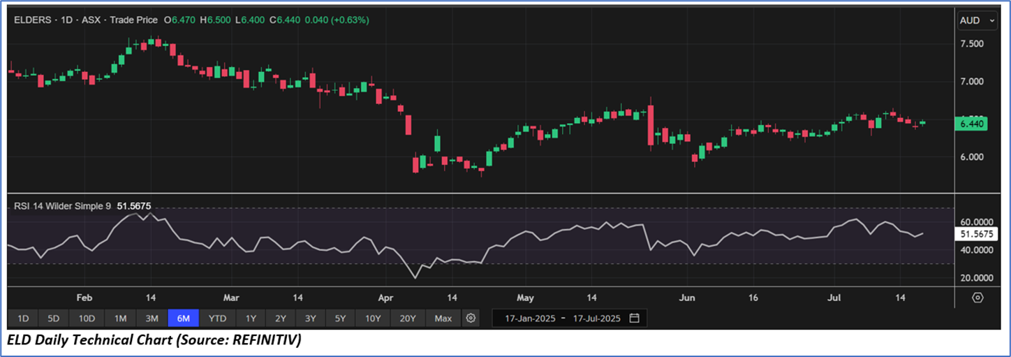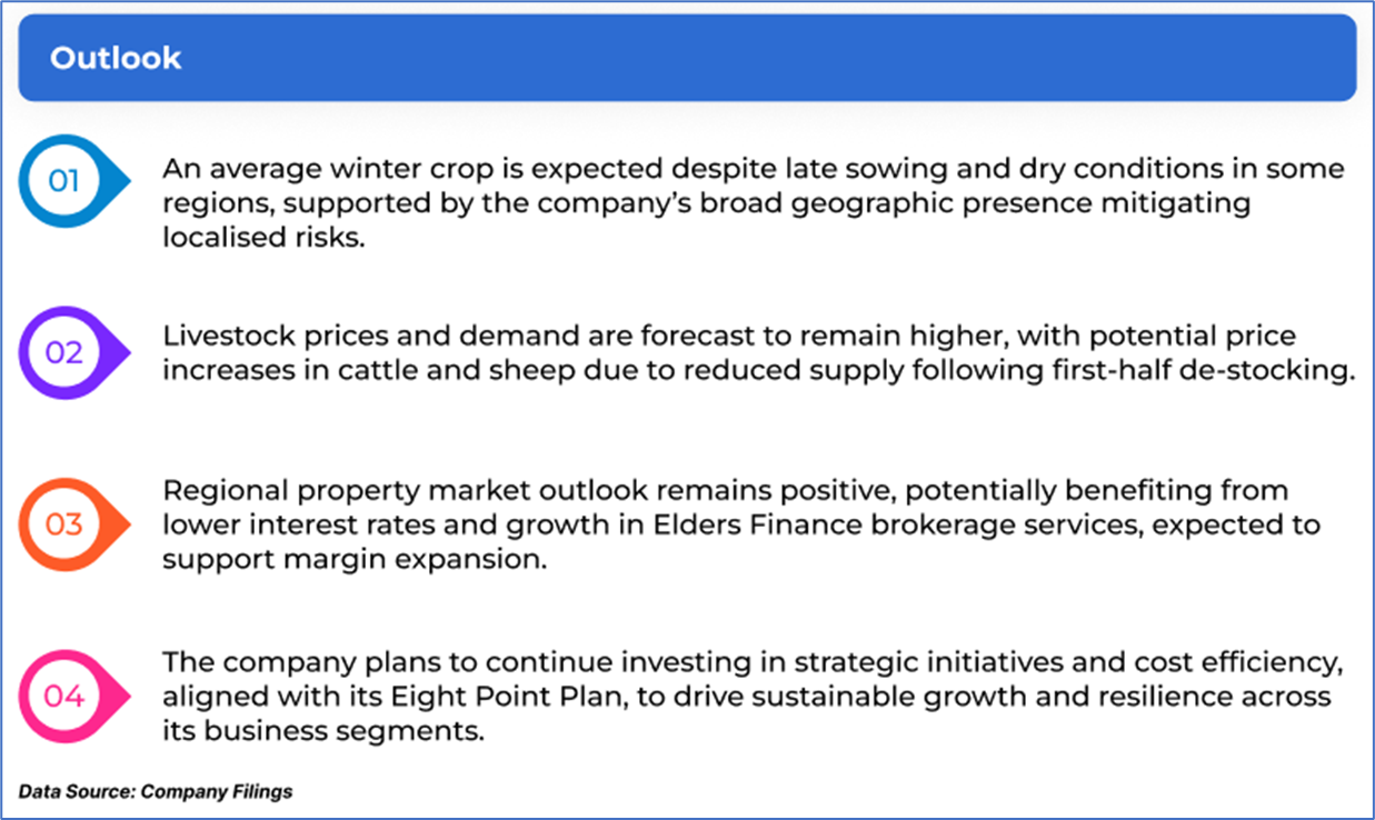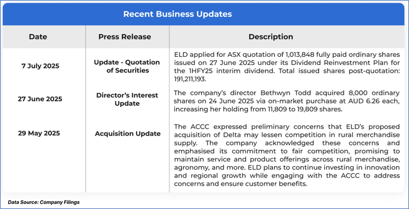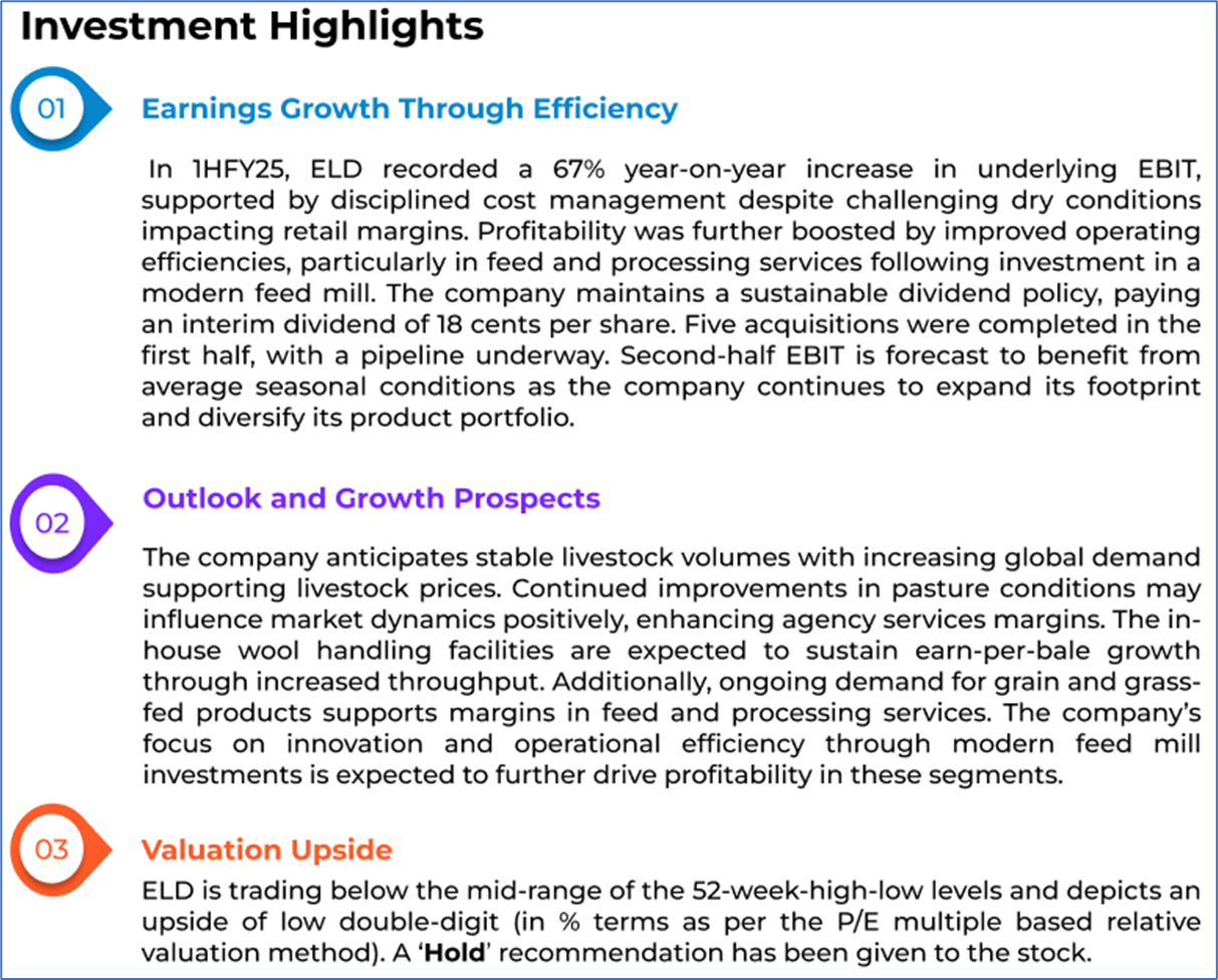 1.1: Company Overview: Elders Limited (ASX: ELD) is an Australian agribusiness offering rural retail and wholesale products, livestock and wool agency services, and real estate solutions. The company also provides digital trading platforms, financial services, and operates in agricultural chemical formulation and cattle feedlotting. With its regional presence, Elders focuses on integrated services and strategic investments to support rural and agribusiness customers. Kalkine’s Dividend Income Report covers the Investment Highlights, Management Insights, Key Financial Metrics, Risks, Technical Analysis along with the Valuation, Target Price, and Recommendation on the stock.