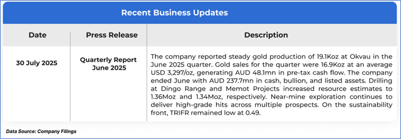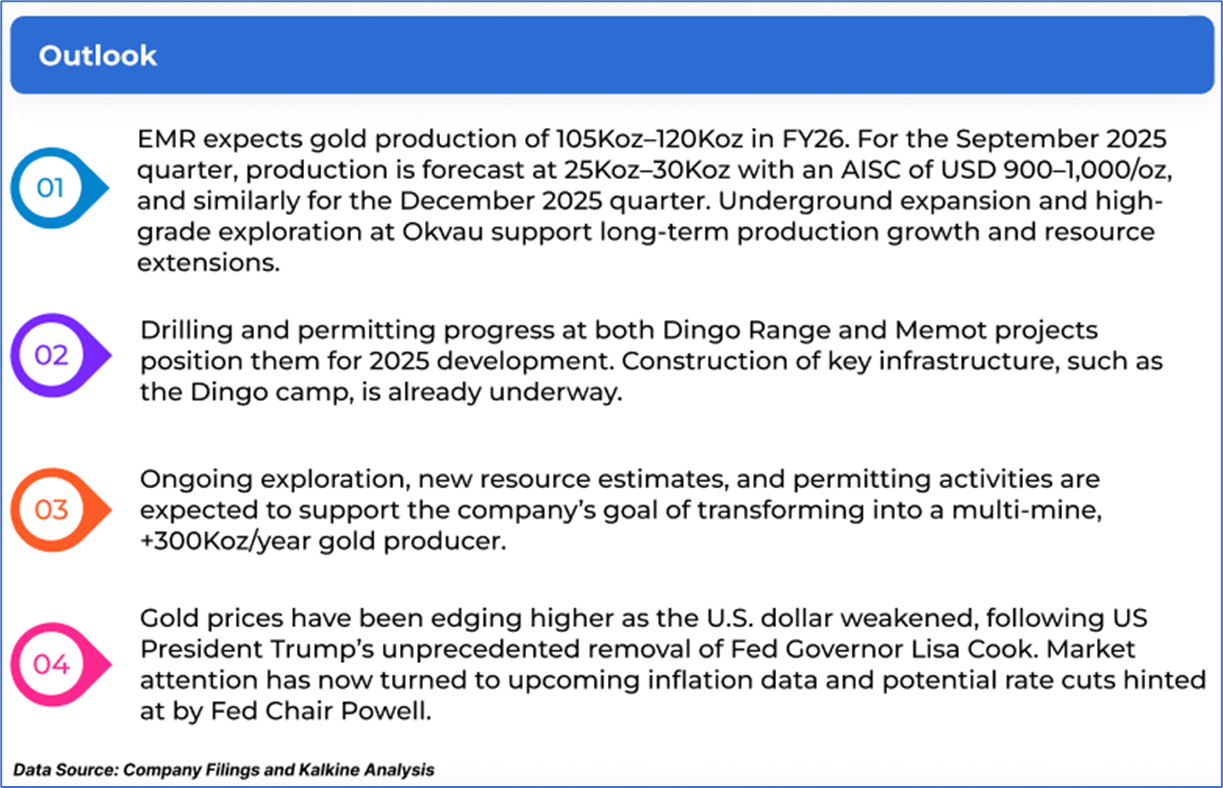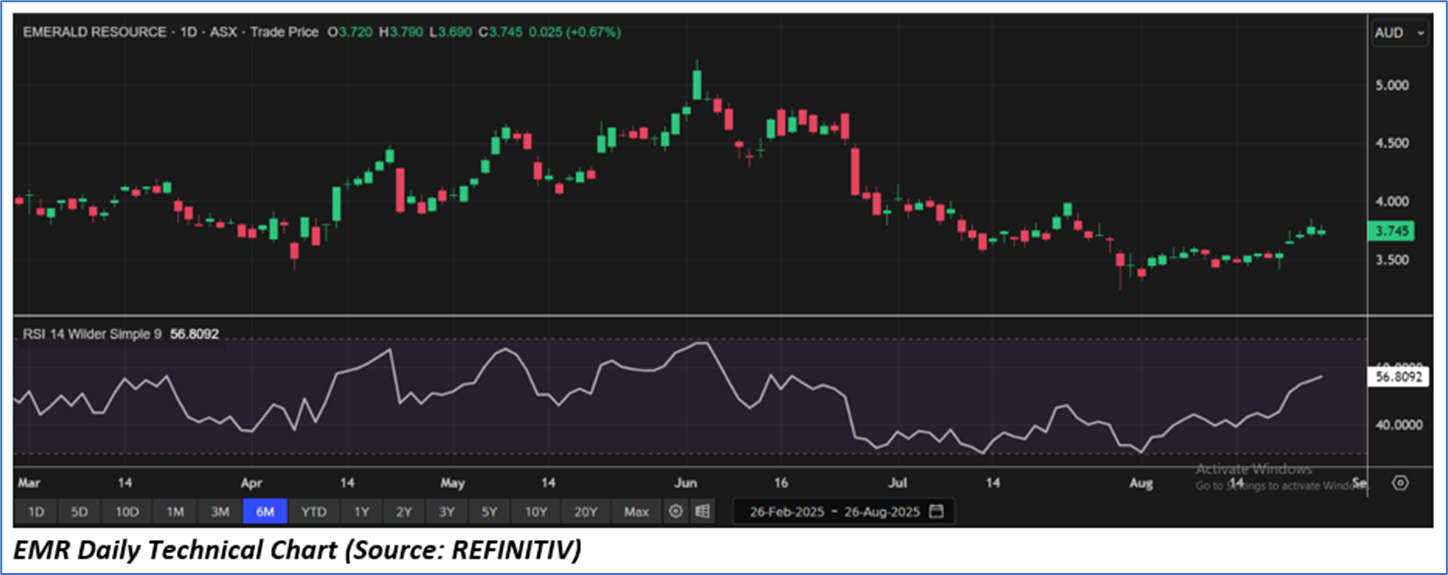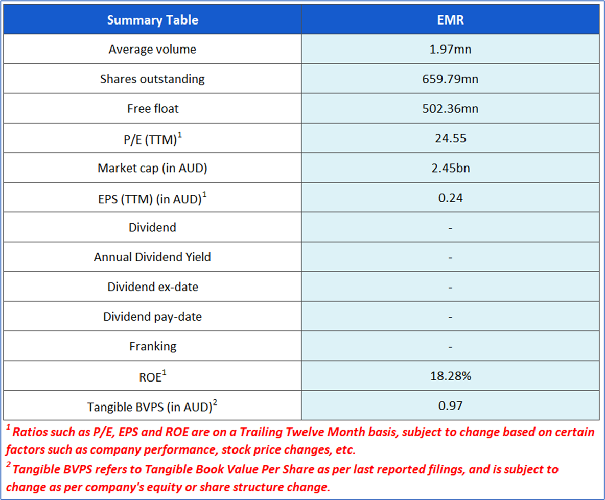 The stock price has gone down by ~0.27% in the last one month and over the last six months, stock prices declined by ~7.04%. The stock has a 52-week low and 52-week high of AUD 3.230 and AUD 5.215, respectively, and is currently trading below the mid of the 52-week-high-low level. EMR was last covered in a report dated ‘29 July 2025’.