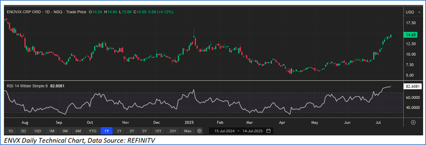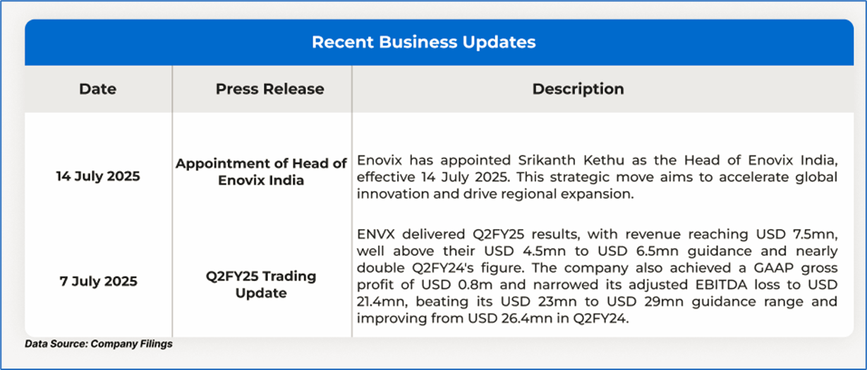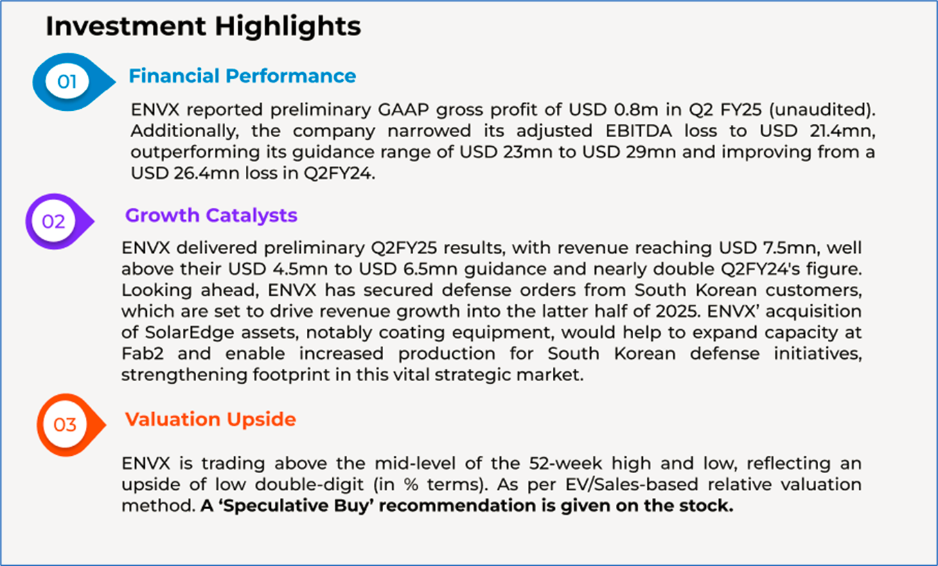 The stock has gone up by ~14.32% in the last nine months, whereas over the last one year, the stock has decreased by ~19.18%. The stock has a 52-week low and 52-week high of USD 5.27 and USD 18.68, respectively, and is currently trading above the average of 52-week high and low. ENVX was last covered in a report dated ‘17 September 2024’.