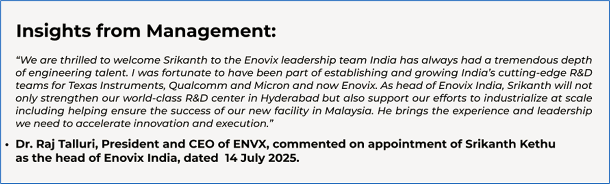Company Overview: Enovix Corporation (NASDAQ: ENVX) is a global high-performance battery company specializing in designing, developing, manufacturing, and commercializing lithium-ion (Li-ion) battery cells that deliver higher energy density and storage capacity compared to traditional battery cells. Kalkine’s Global Fully Charged Report covers the Investment Highlights, Management Insights, Key Financial Metrics, Risks, and Technical Analysis along with the Valuation, Target Price, and Recommendation on the stock.
