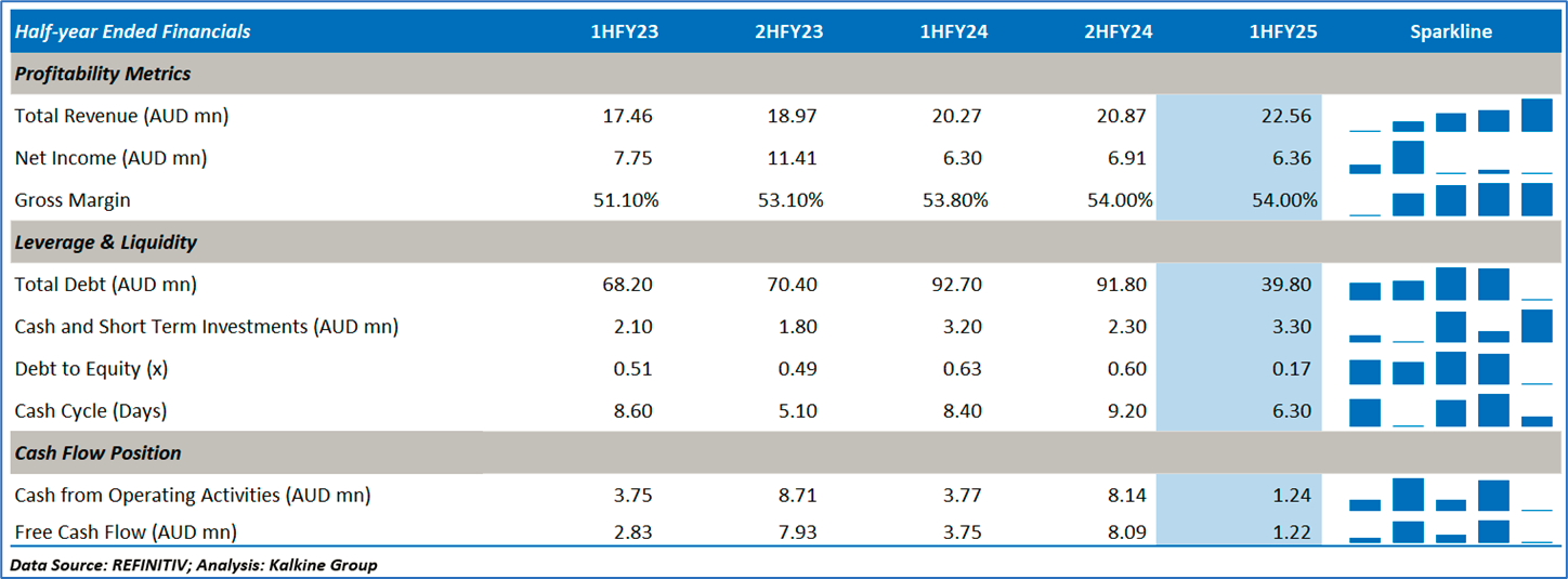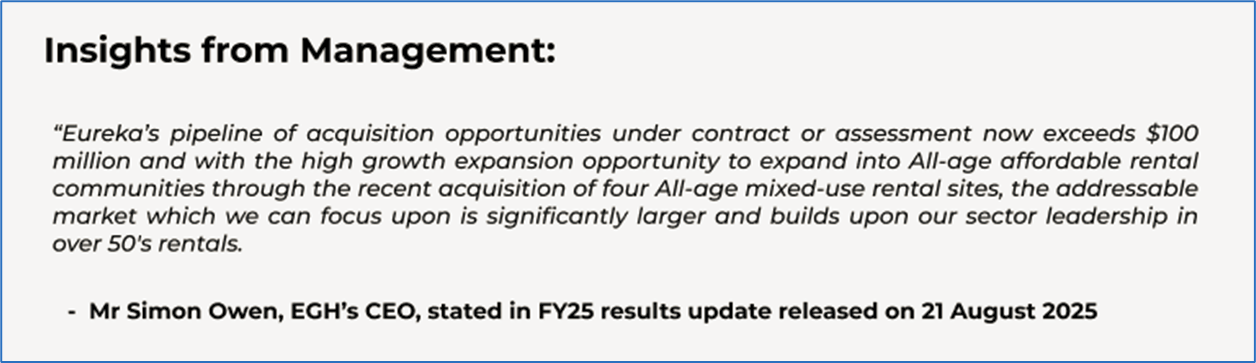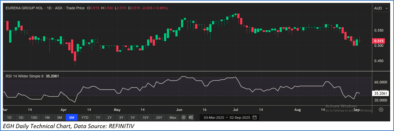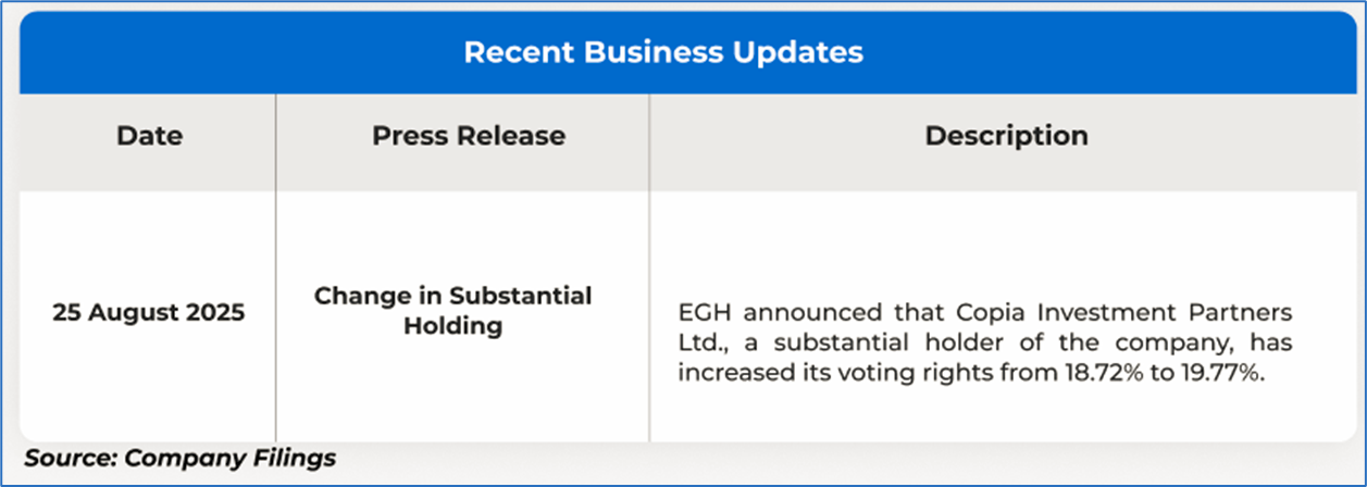 The stock price went down by ~7.6% in last one month and over the last nine months, stock prices went down by ~12.7%. The stock has a 52-week low and 52-week high of AUD 0.435 and AUD 0.700, respectively, and is currently trading below the mid-range of the 52-week-high-low levels. EGH was last covered in a report dated ’08 July 2025’.