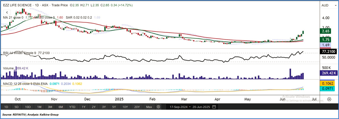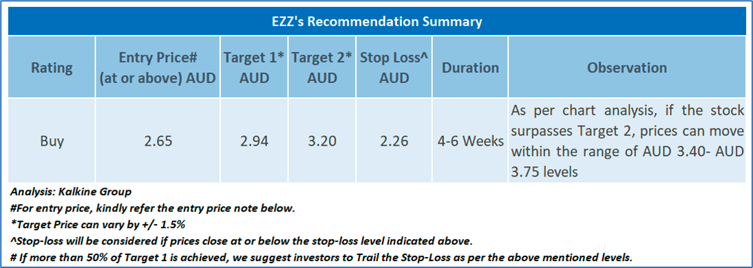 As per the above-mentioned price action and technical indicators analysis, a ‘Buy’ rating has been given on Newmont EZZ Life Science Holdings Limited (ASX: EZZ) at closing price of AUD 2.65 as on June 20, 2025.