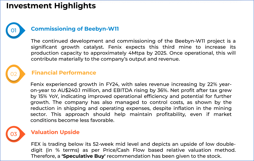 1.1 Fenix Resources Ltd (ASX: FEX) is a fully integrated mining, logistics, and port services company based in the Mid-West region of Western Australia. The company operates a unique, vertically integrated business model that combines high-quality iron ore production with efficient logistics and port services. Fenix’s operations include the Iron Ridge mine, the Beebyn-W11 Deposit, the Twin Peaks Iron Ore Mine, and the Shine Iron Ore Mine, as well as its fully owned Newhaul Road and Port Logistics businesses. Kalkine’s Resources Report covers the Investment Highlights, Key Financial Metrics, Risks, Technical Analysis along with the Valuation, Target Price, and Recommendation on the stock.