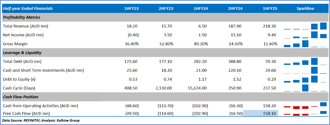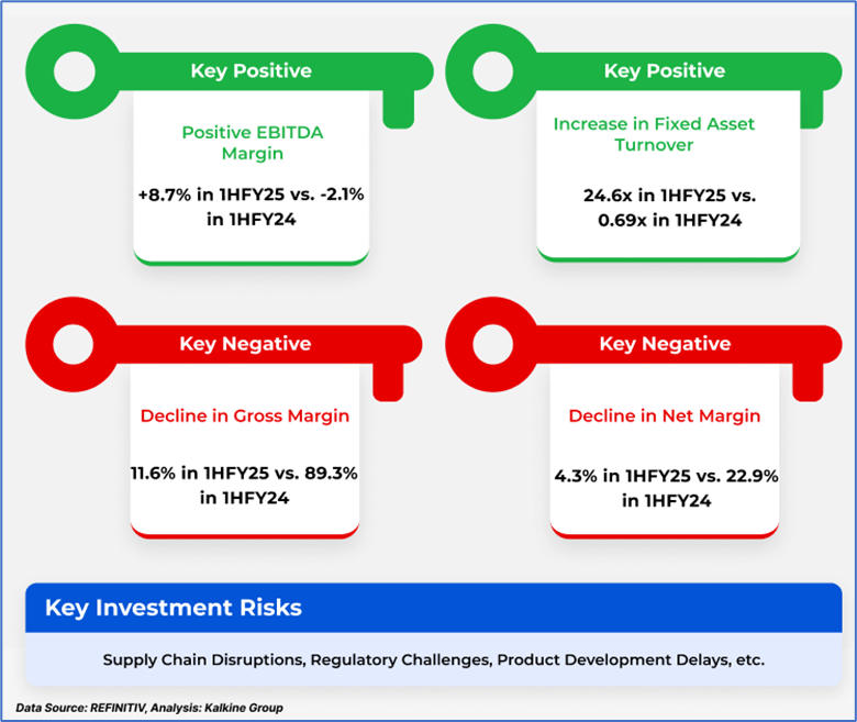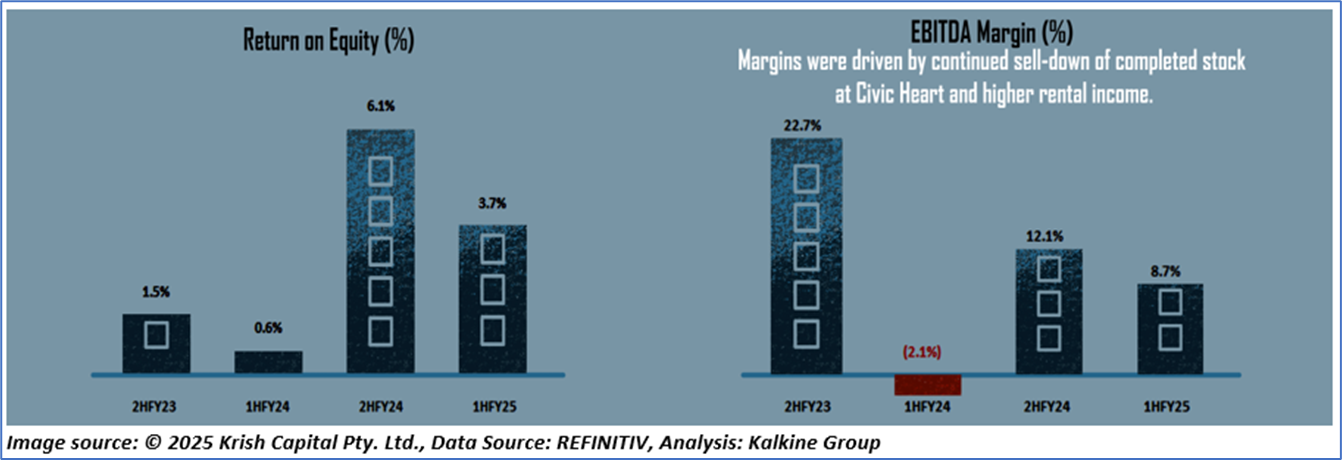 The D/E ratio stood at 0.29x in 1HFY25, lower than the year-ago figure of 1.17x. Below is captured other metrics showing the trend of Return on Equity and EBITDA margin: