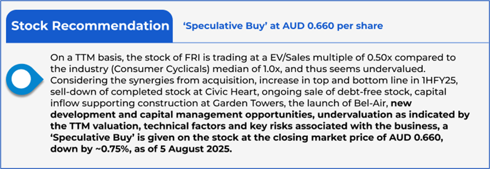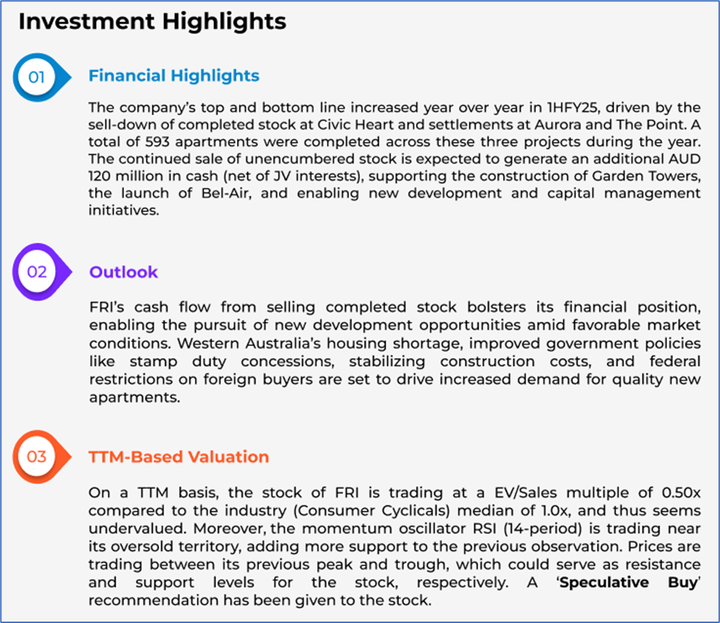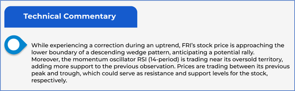 The stock has dipped by ~15.38% in the last six months, and over the past nine months, it has decreased by ~25.42%. The stock has a 52-week low and 52-week high of AUD 0.660 and AUD 0.990, respectively, and is currently trading at the 52-week-low level. FRI was last covered in a report dated ’10 July 2025’.