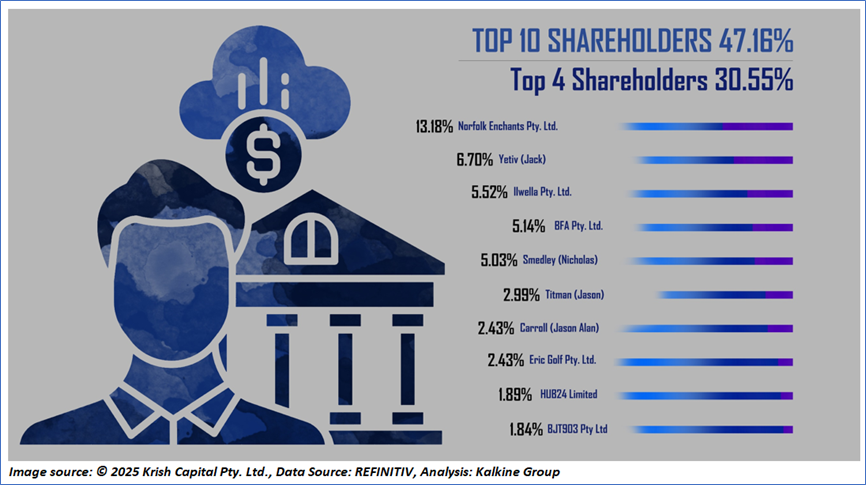 The top 10 shareholders together form ~47.16% of the total shareholding. Norfolk Enchants Pty. Ltd., and Yetiv (Jack) are holding maximum stakes of 13.18% and 6.70%, respectively.