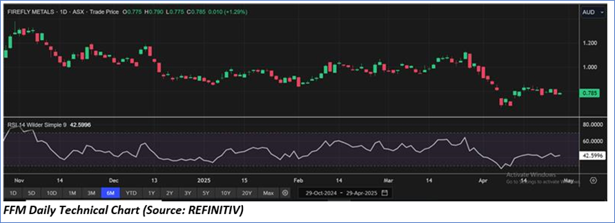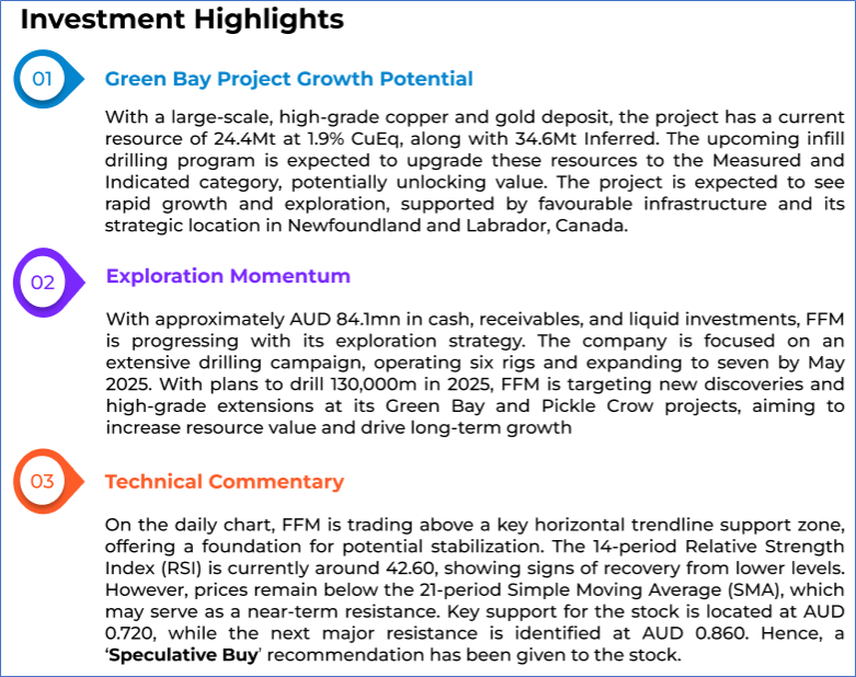 1.1: Company Overview: FireFly Metals Limited (ASX: FFM) is an emerging copper-gold company focused on the Green Bay Copper-Gold Project in Newfoundland, Canada. The company holds a 70% interest in the Pickle Crow Gold Project in Ontario and a 90% interest in the Limestone Well Vanadium-Titanium Project in Western Australia. FireFly Metals is committed to advancing its diverse portfolio of mineral assets across multiple regions. Kalkine’s Gold Report covers the Investment Highlights, Management Insights, Key Financial Metrics, Risks, Technical Analysis along with the Valuation, Target Price, and Recommendation on the stock.