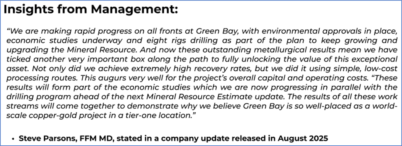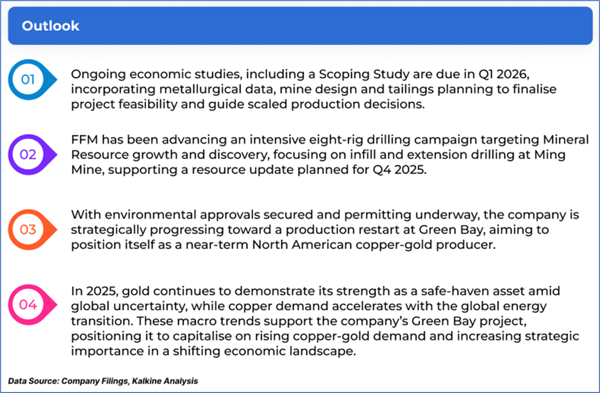 1.1: Company Overview: FireFly Metals Limited (ASX: FFM) is an emerging copper-gold company focused on the Green Bay Copper-Gold Project in Newfoundland, Canada. The company holds a 70% interest in the Pickle Crow Gold Project in Ontario and a 90% interest in the Limestone Well Vanadium-Titanium Project in Western Australia. FireFly Metals is committed to advancing its diverse portfolio of mineral assets across multiple regions. Kalkine’s Gold Report covers the Investment Highlights, Management Insights, Key Financial Metrics, Risks, Technical Analysis along with Target Price and Recommendation on the stock.