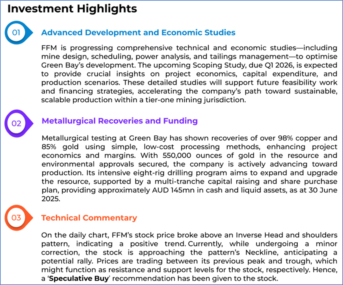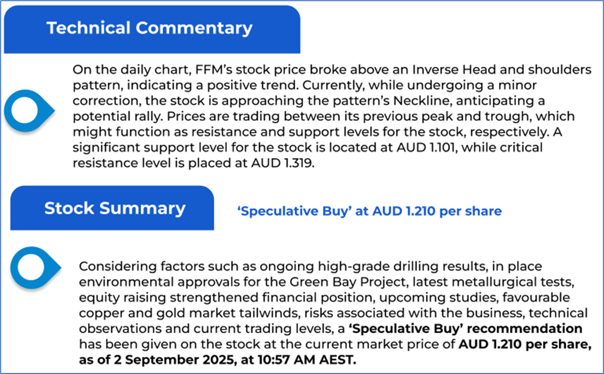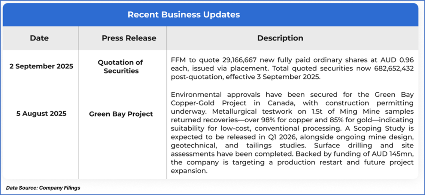 The stock price has gone up by ~14.29% in the last one month and over the last six months, stock prices increased by ~23.71%. The stock has a 52-week low and 52-week high of AUD 0.665 and AUD 1.380, respectively, and is currently trading above the average of the 52-week-high-low level. FFM was last covered in a report dated ‘15 May 2025’.